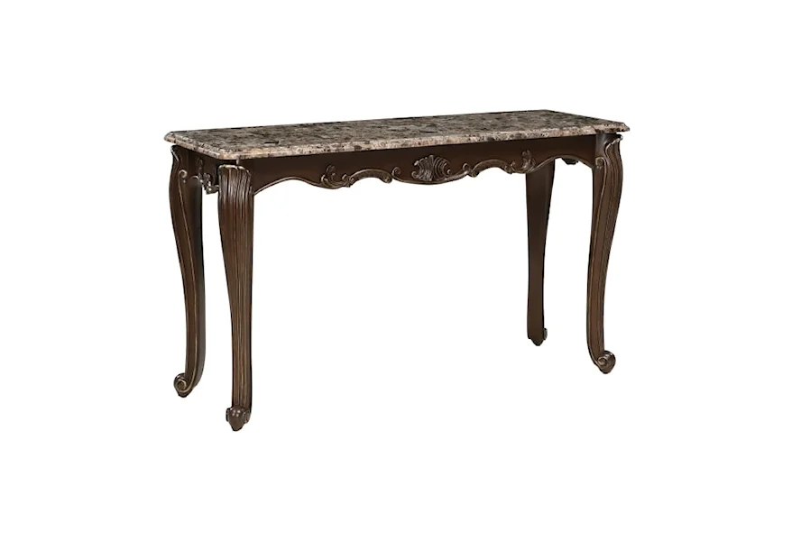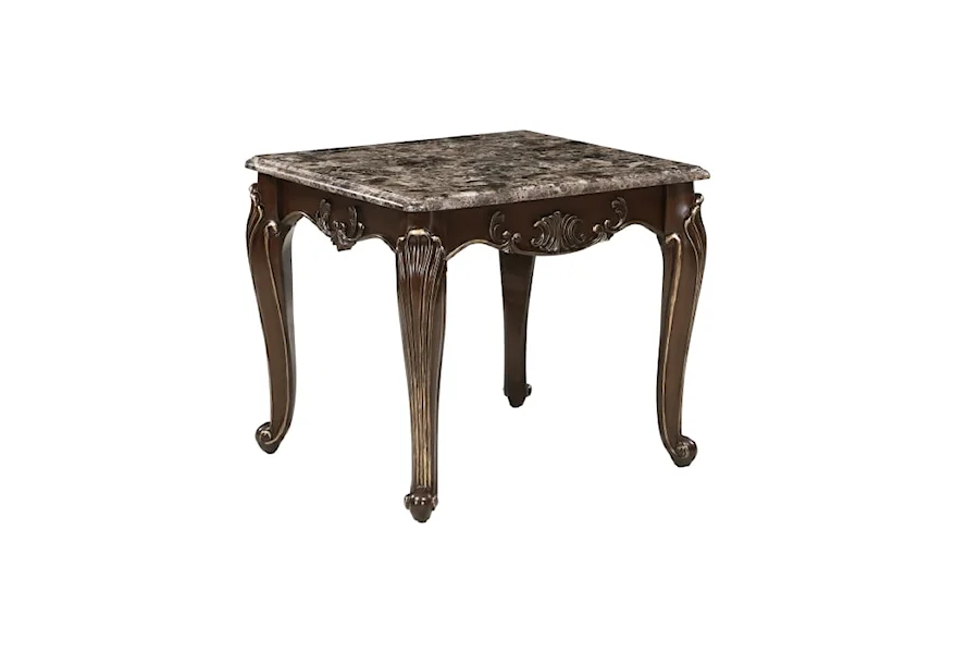 An elegant combination of traditional elements is paired to create the timeless look of the Balthasar Collection. Genuine marble tops the cocktail table, while supported by classic cabriole legs. The table’s apron features decorative scroll detail, solidifying the traditional styling. Complementing the brown tone marble is the cherry finish, accented by gold tipping.