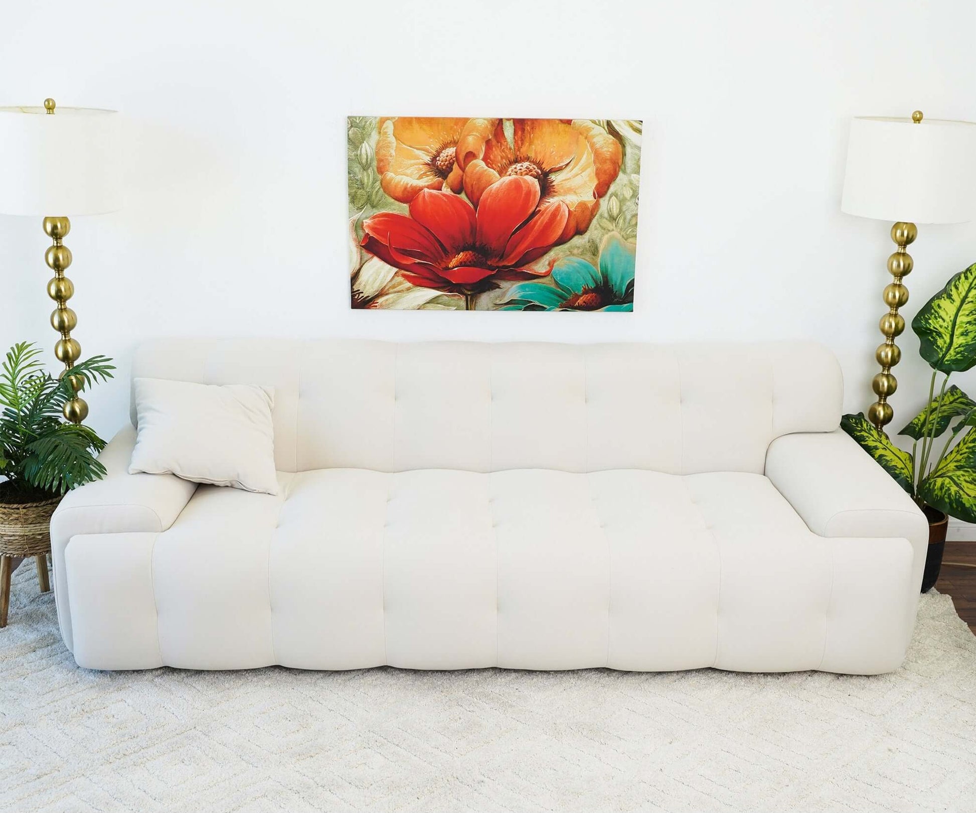 Crafted with plush velvet upholstery, its elegant cream hue adds sophistication to any space. Sink into its soft cushions and unwind in style. A timeless piece that exudes opulence and invites relaxation.