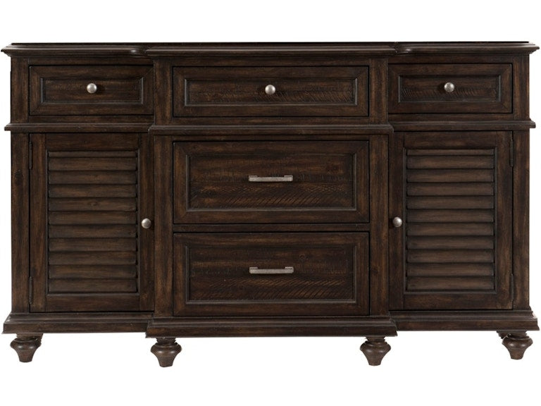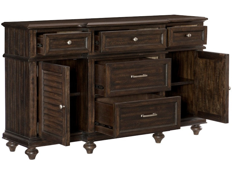 Product Description The solid transitional styling of the Cardano Collection creates an impactful design presence in your dining room. Utilizing distinct accent techniques - plank effect, rasping, saw marks - and pairing them with traditional framing and a rich finish - driftwood charcoal over acacia veneers - creates a collection that is worthy of your dining room. Pewter-finished hardware mounted on the functional drawers and doors of the server provides a subtle contrast to the wood's dark finish. The buffet server, with its wood door and drawers, serves dual purpose as the china's base and as a stand-alone sideboard.