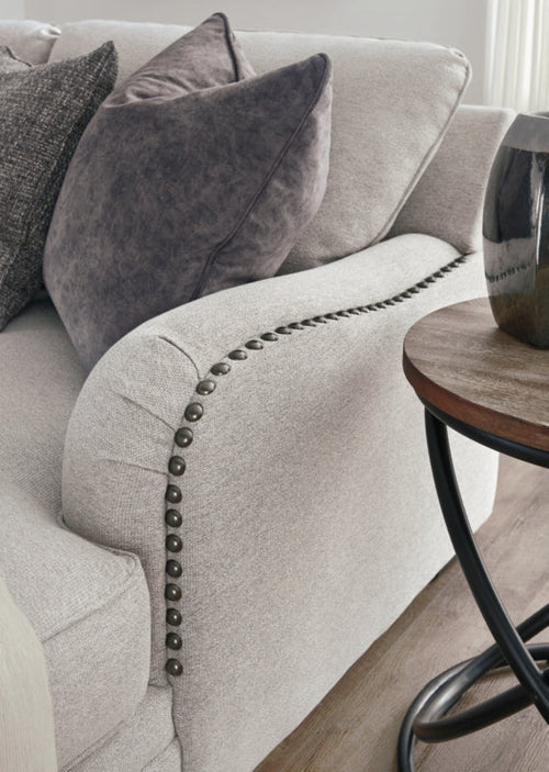 Looking for a “transitional” look that’s as comfortable in contemporary spaces as it is in classic surroundings? Rest your eyes on the beauty of this sectional. Soft, tight woven texture with chalky beige hue is so in the now. Gracefully curved arms punctuated with oversized nailhead trim infuse a sense of everyday elegance.