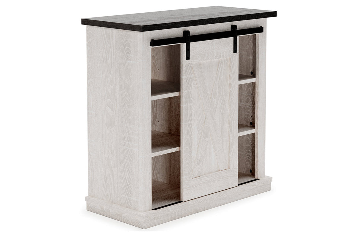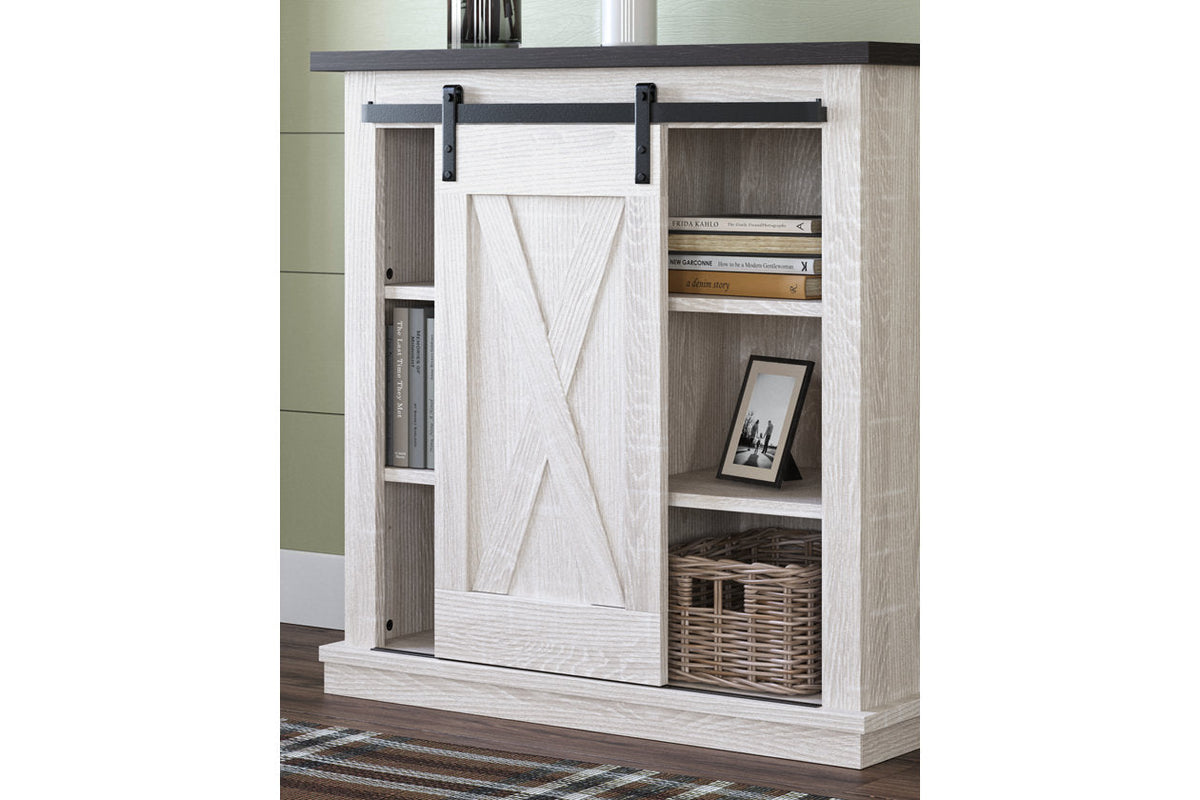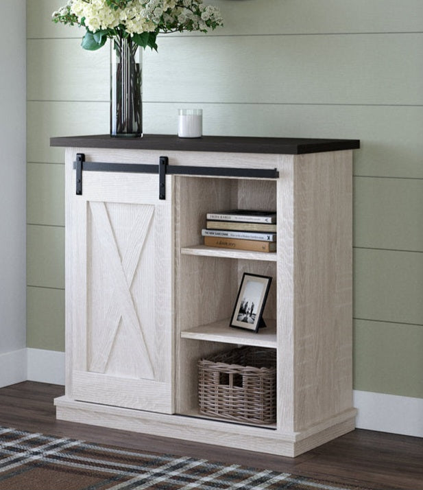Raise the bar on modern farmhouse design with this accent cabinet. Sporting a two-tone, gray and antiqued white color scheme and a crossbuck door front, this cabinet's sliding "barn door" moves to reveal shelved storage space. What a charming complement to your casual-chic decor.
