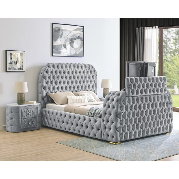 Natalia Grey Velvet FIREPLACE/TV STAND Queen Panel Bed 5115