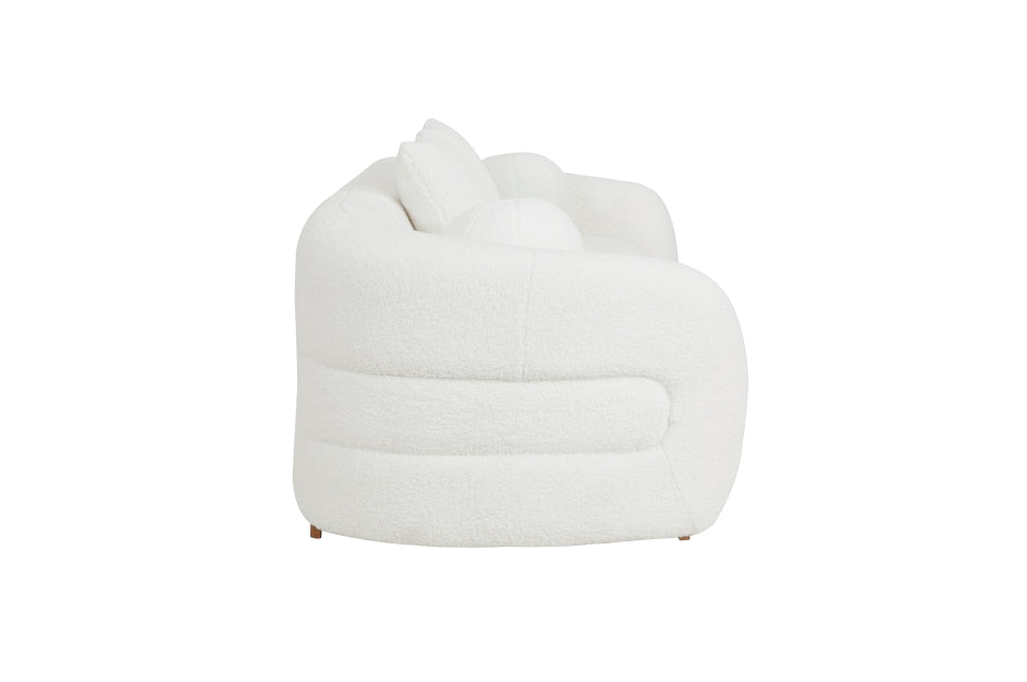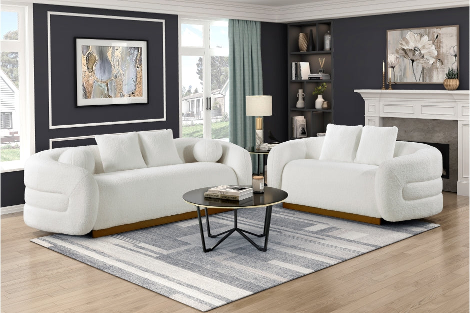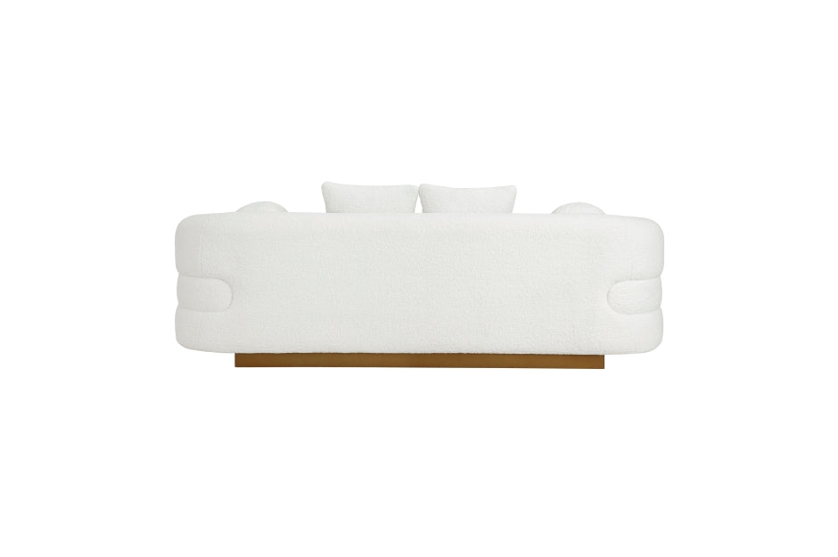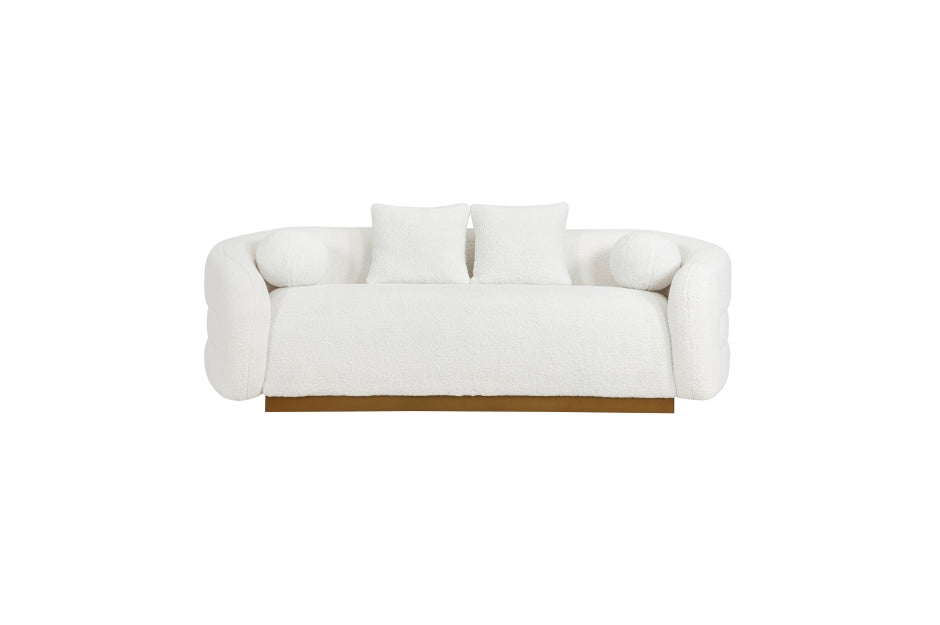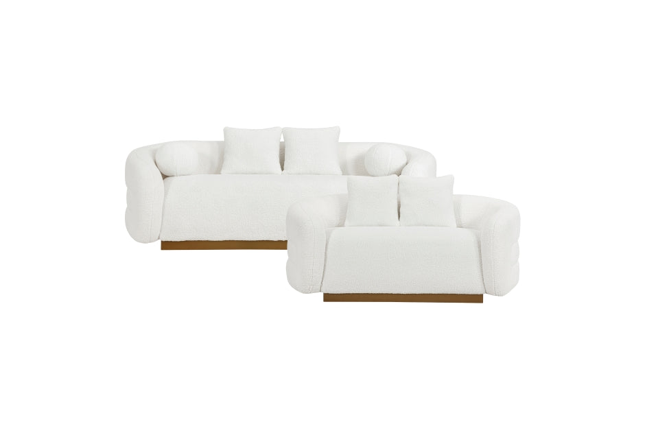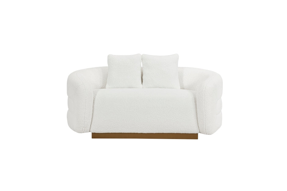 Experience comfort and style with this luxurious Novella Swivel Chair upholstered in cozy sherpa fabric. The soft Sherpa fabric upholstery ensures a cozy seating experience, while the attached back and seat cushions provide effortless comfort. The chair combines soft texture with functionality, featuring a smooth 360-degree swivel for effortless movement. Complete with two matching pillows, this sofa and love seat is the perfect blend of comfort and contemporary design, making it an ideal choice for any modern living room. The sturdy solid wood base with a gold finish provides a modern, elegant foundation.