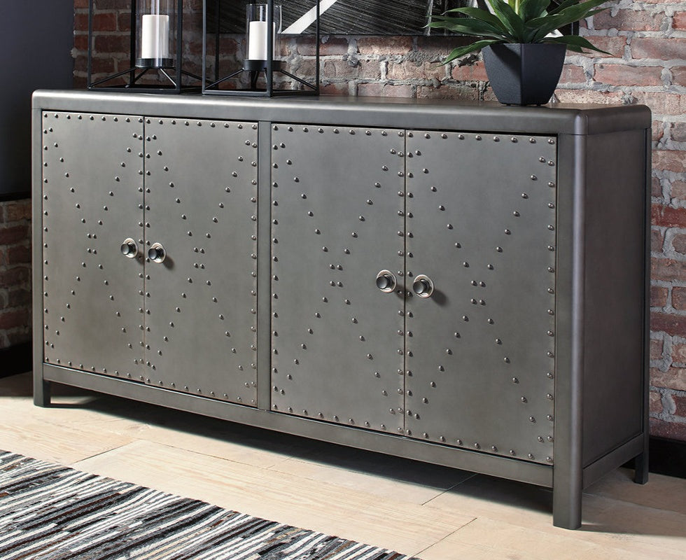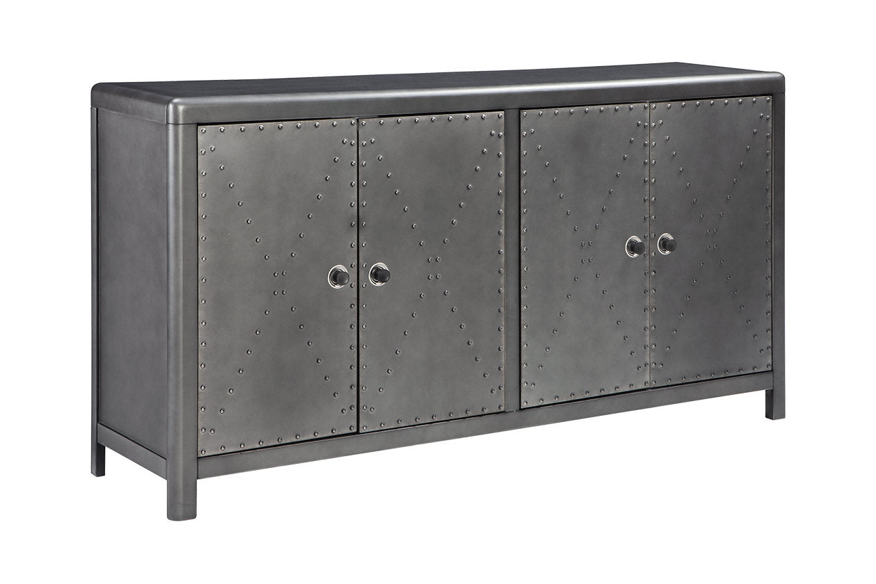 Whether storing plates and linens in the dining room, supplies in the home office or serving as a TV console, this 4-door accent cabinet works a modern industrial look loaded with versatility. Antique gunmetal finish—punctuated with nailhead accents—wows with retro-chic charm.