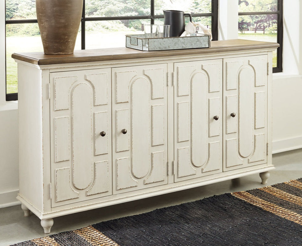 Whether your style is cottage chic, boho inspired or uniquely eclectic, this accent cabinet is sure to look right at home. Standout elements include raised panel door fronts that are a work of art. Wonderfully timeworn in antique white, this 4-door cabinet is topped with a warm brown finish for two-tone interest. Two adjustable shelves add to its practicality.