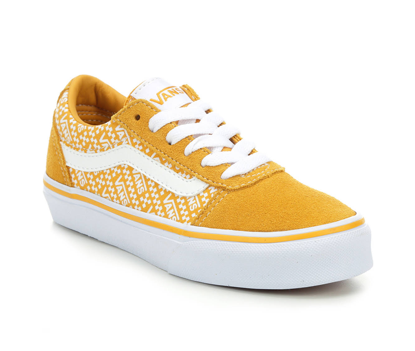 Perfect his casual style with the Vans Ward! These sneakers feature a cushioned insole, canvas upper, and classic stripe detail. Keep their skater style fresh with the Vans Ward! Lace-up closure,Vans logo on tongue and sides,Soft fabric lining,Cushioned insole,Vulcanized midsole,Stitching details,Vans Original Waffle rubber outsole for grip,Canvas upper,Vans branding details | Boys' Vans Little Kid & Big Kid Ward Skate Shoes in Golden/Logo/White Size 1.5 - Little Kid Medium