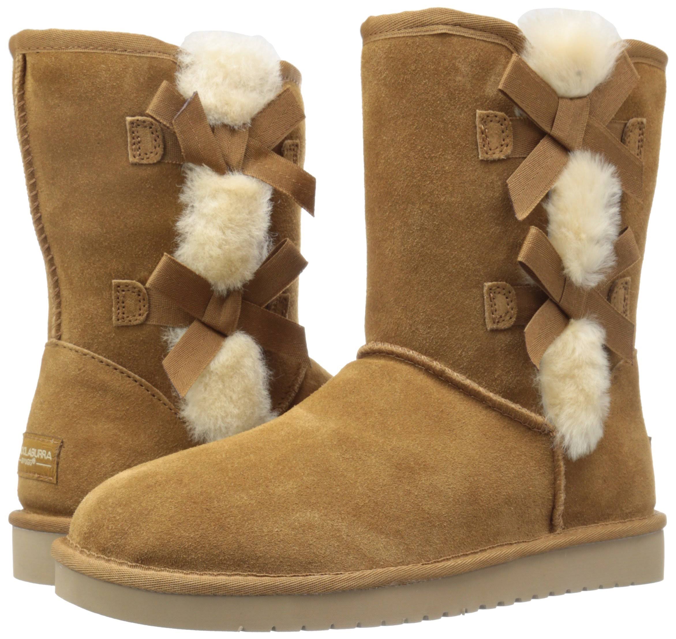 A little chic, a little sweet, and a whole lot comfy. The Koolaburra Victoria Short Boot offers a fresh take on the original Koola Short Boot, adorned with flirty bows and exposed sheepskin. These sheepskin-lined boots are materialized in soft suede and lined in a combo of plush sheepskin and faux fur, the feminine silhouette is finished with a sockliner and street-ready sole that'll transition from uptown to downtown with ease. Cow suede upper Sheepskin/Faux Fur lining and insole Thinsulate sockliner Fixed, decorative bows Durable molded EVA sole.