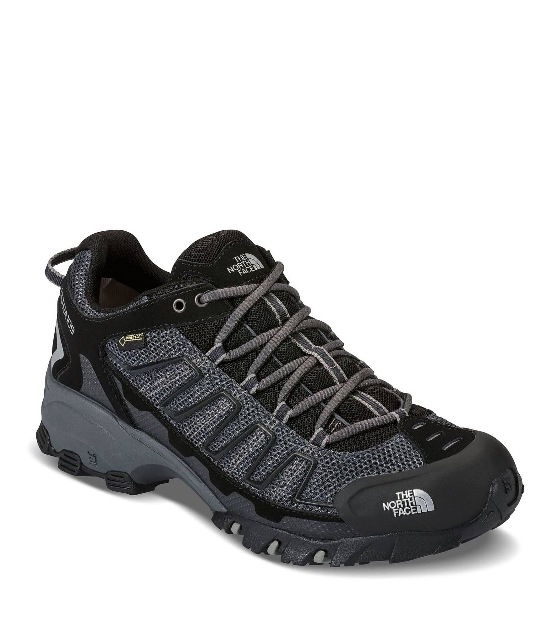 For maximum protection underfoot and subtle pronation correction, wear the Ultra 109 Trail Running Shoe when blazing down slick, uneven trails. GORE-TEX fabric membrane for waterproof stability. Constructed with a full-length EVA midsole, a midfoot shank and rigid Snake Plate under the ball of the foot for enhanced protection. Rugged, double UltrATAC rubber soles gain traction for solid footing on wet or dry surfaces. Size: 7 M. Color: TNF Black/Dark Shadow Grey. Male. Age Group: Adult.