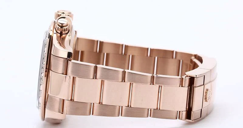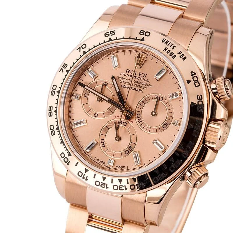 The beautiful Rolex 116505PKDO watch features a gold 40mm case, with a fixed bezel, and a pink gold dial covered by a scratch resistant sapphire crystal. The stylish wristwatch is equipped with an exclusive 18kt everose gold rolex oyster which combines comfort and sturdiness. This horological trendy device has chronograph, hour, minute, second, chronometer functions. At the heart of this timepiece is Rolex Calibre 4130. The Automatic movement operates at 28800 A/h and keeps the hands revolving smoothly and accurately for precise, reliable timekeeping. It contains 44 Jewels, and picks up all the advantages of this high-performance 榚ngine?gid including a 72-hour power reserve. This magnificent watch has a water resistance of up to 330 feet/100 meters, suitable for recreational surfing, swimming, snorkeling, sailing and water sports. This elegant Swiss-made masterpiece is sure to complete any man's collection.