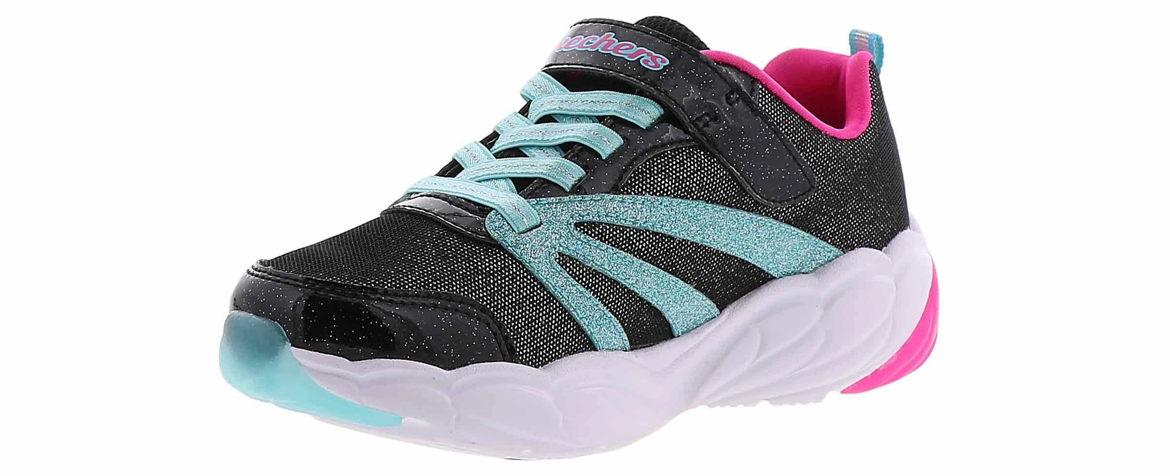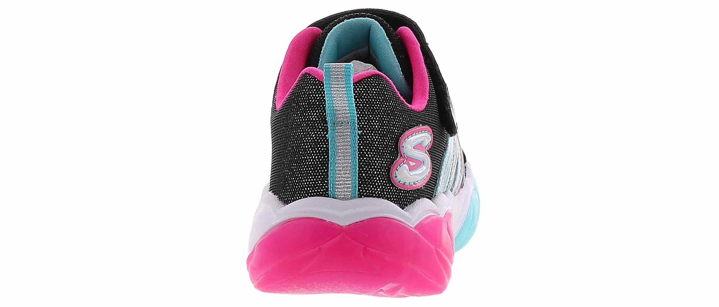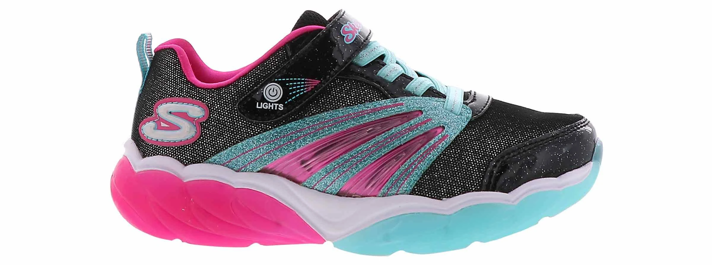 Keep those lights going strong and bright with the SKECHERS S Lights: Fusion Flash shoe. Sporty mesh and synthetic upper in a slip on stretch laced front casual light up sneaker with 'hidden' lights, sporty detail and on/off light switch. Sporty mesh fabric upper Smooth metallic synthetic panels and textured sporty overlays Slip on stretch laced front sporty casual light up sneaker design Side panels feature textured metallic colorful overlay details Metallic panels with light-through feature for more lighted fun Shiny patent synthetic overlay accents on toe and instep Stretch laced front panel for easy slip on fit Instep strap with adjustable closure Adjustable side hook and loop closure Padded collar and tongue Cushioned insole Translucent dual color midsole panels Eight bright lights sit inside midsole panels Lights chase and then blink with every step! Midsole lights also light up side panel details On/Off switch on strap can deactivate lights Shock absorbing midsole with sculpted texture detail Flexible nonmarking traction outsole.
