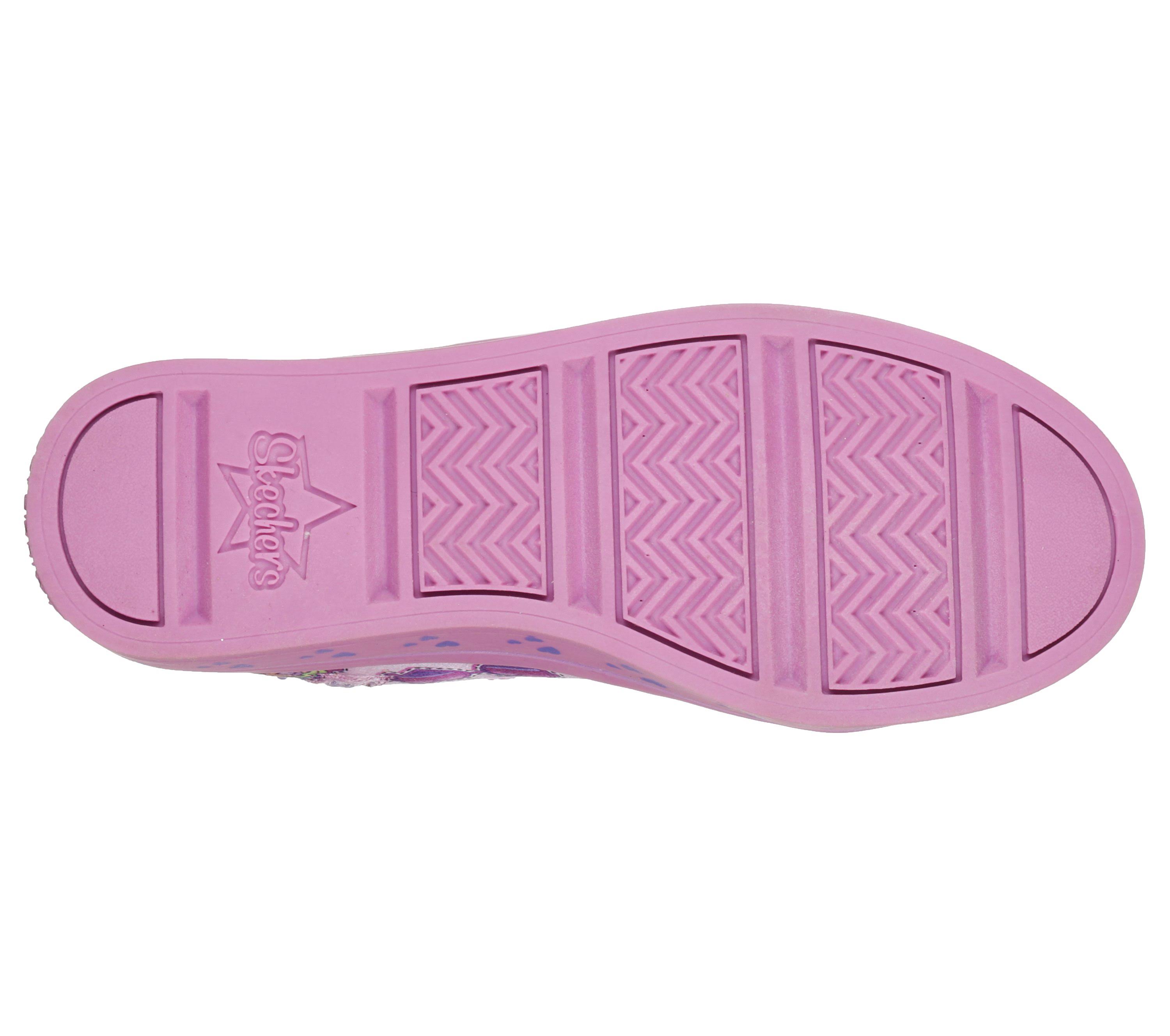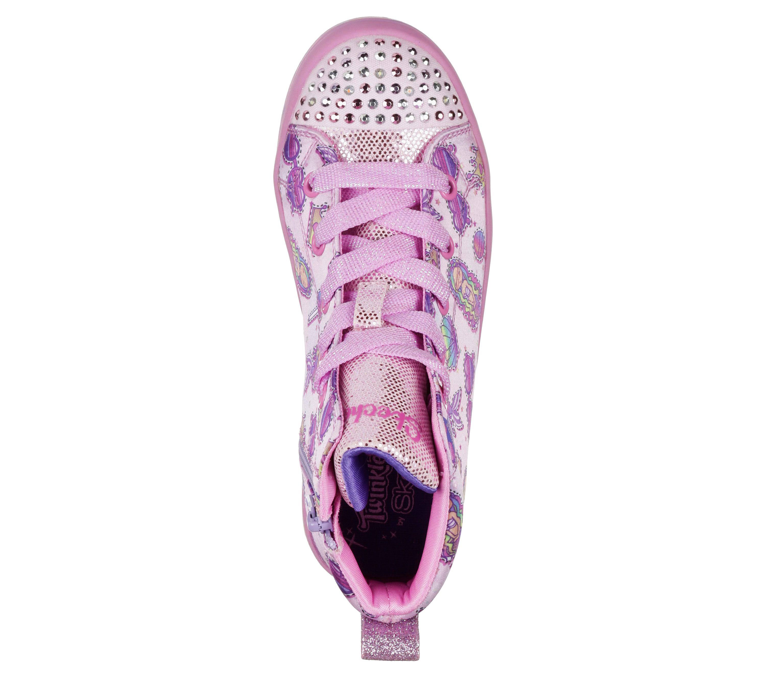 Oceans of adorable style and light-up fun come in the SKECHERS Twinkle Toes: Twi-Lites - Mermaid Party High Top. Soft satiny-finish fabric and metallic finish fabric upper in a lace up casual light-up high top sneaker with mermaid print design, stitching and overlay accents. All over cute 'Mermaid Party' print Textured metallic finish contrast colored fabric overlays at tongue and heel Print includes mermaids, shells, hearts and more Fabric toe cap overlay Glittering colorful rhinestud sequin detail on toe cap Light up accents on toe blink with every step! Lace up front with metal eyelets Heel panel metallic fabric overlay with top tab Star shaped on/off switch for lights Full length side zipper for easy access Padded collar and tongue Soft fabric shoe lining Cushioned insole Shock absorbing lightweight midsole Midsole with heart print design Vulcanized rubber midsole Textured toe bumper front Flexible traction outsole 1/2 inch heel.
