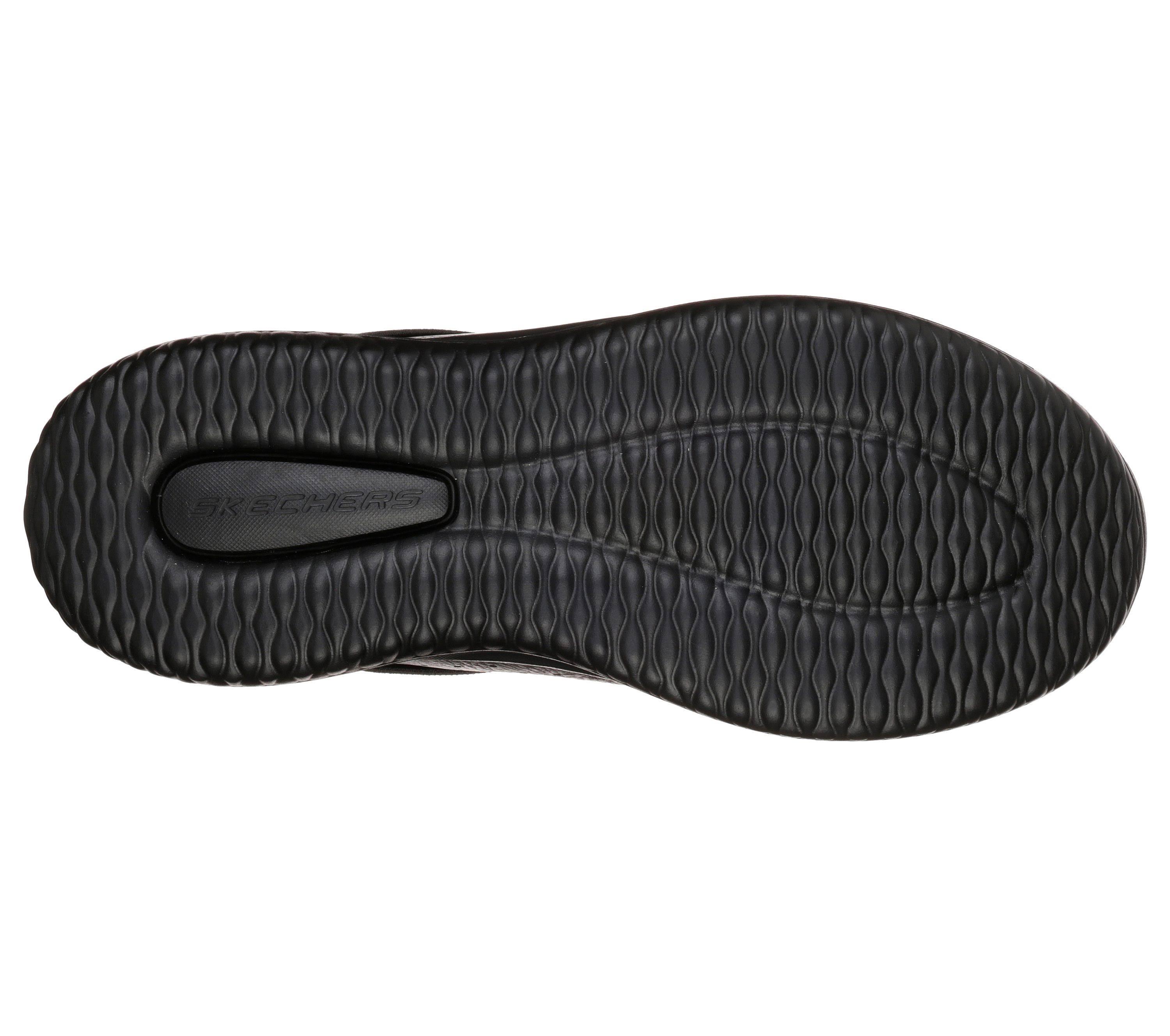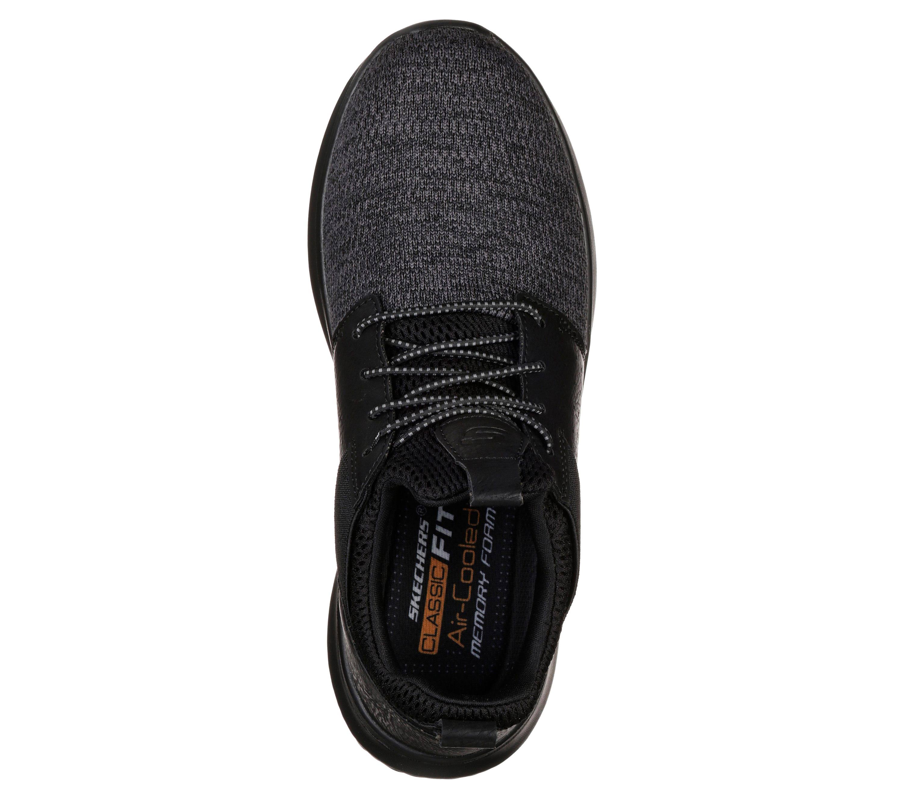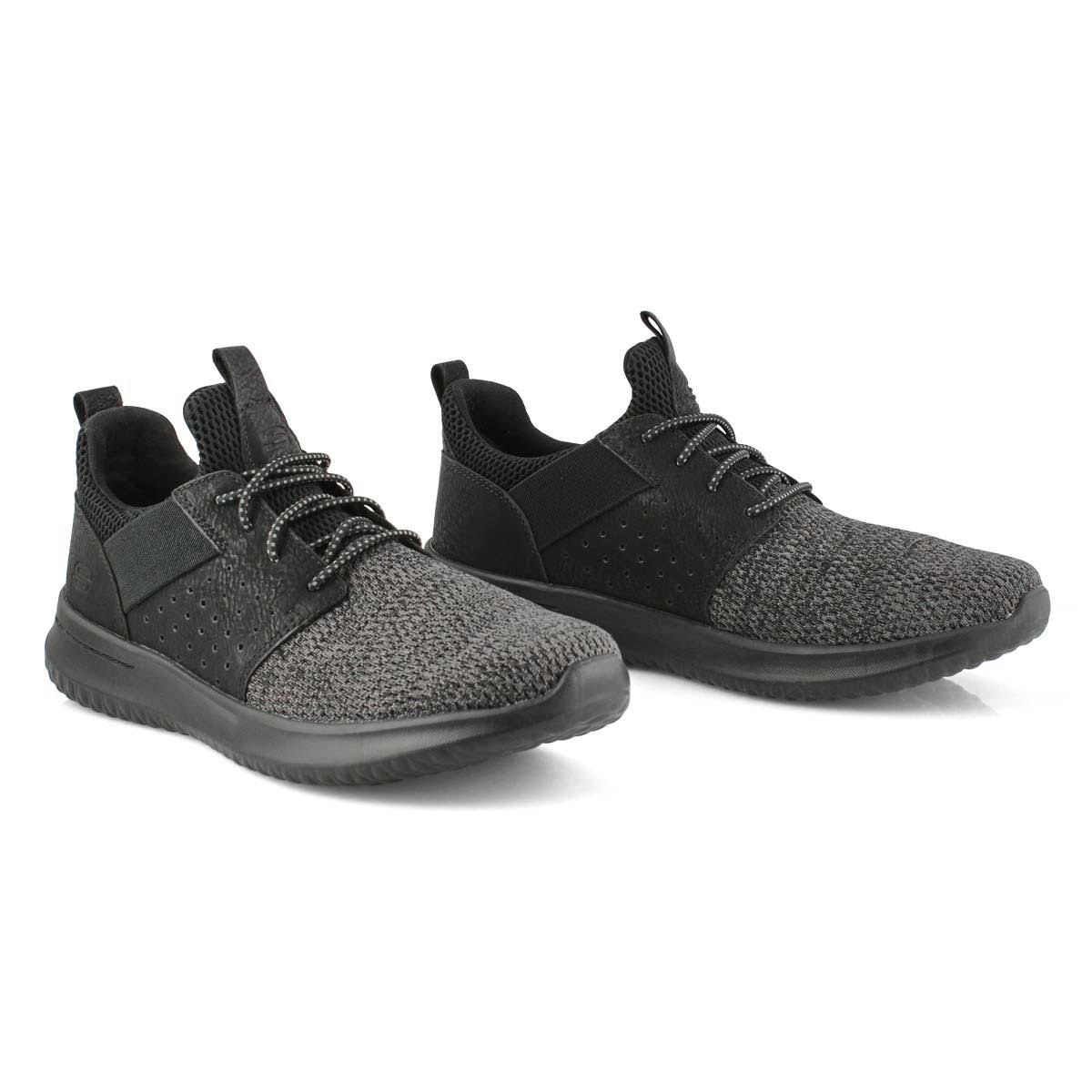 Instant sporty style and lightweight comfort delivers in the DELSON CAMBEN black slip on sneaker from SKECHERS. Features a soft lightweight knit-mesh fabric upper with soft fabric shoe lining. Stretch fabric side strap panels for easy fit. Heel & instep faux-leather pull on loop accents. Air Cooled Memory Foam cushioned comfort insole for all day comfort.