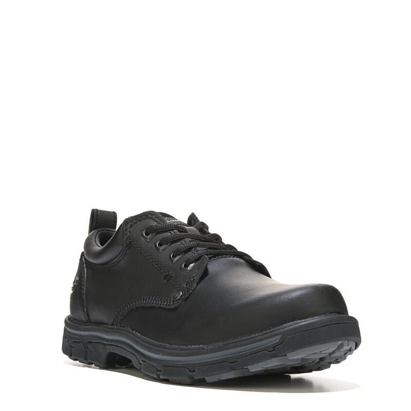 Real style and comfort: the Rilar Memory Foam Oxford from Skechers. Leather upper in a casual oxford style with a round toe. Lace-up front. Metal stud detail. Stitching accents and reinforced seams. Side and heel overlay detail. Small label detail and embossed S detail. Heel pull tab. Padded tongue and collar. Soft fabric lining Memory Foam cushioned comfort insole. Shock absorbing midsole. Flexible rubber traction outsole 1 inch heel.