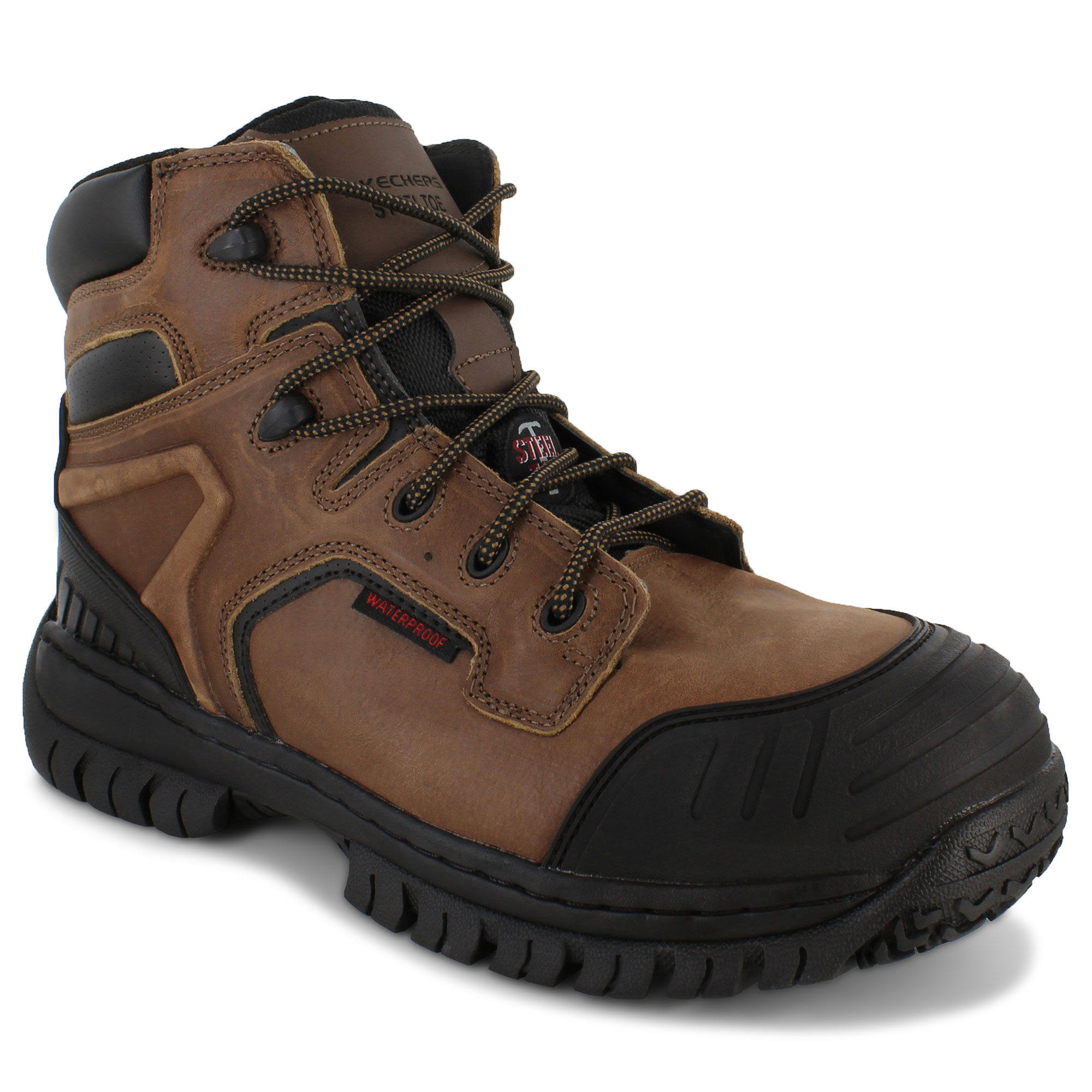 Electrical hazard safe design. Rubber lugged traction outsole is oil resistant. Natural finish leather look. Waterproof seam sealed upper design. Durable toe and heel synthetic overlays. Heel overlay panel with pull on top fabric loop. Lace-up front with nonmetallic eyelets and top hooks. Padded collar and tongue. 6" standard work boot shaft height. Memory foam full length cushioned comfort insole.
