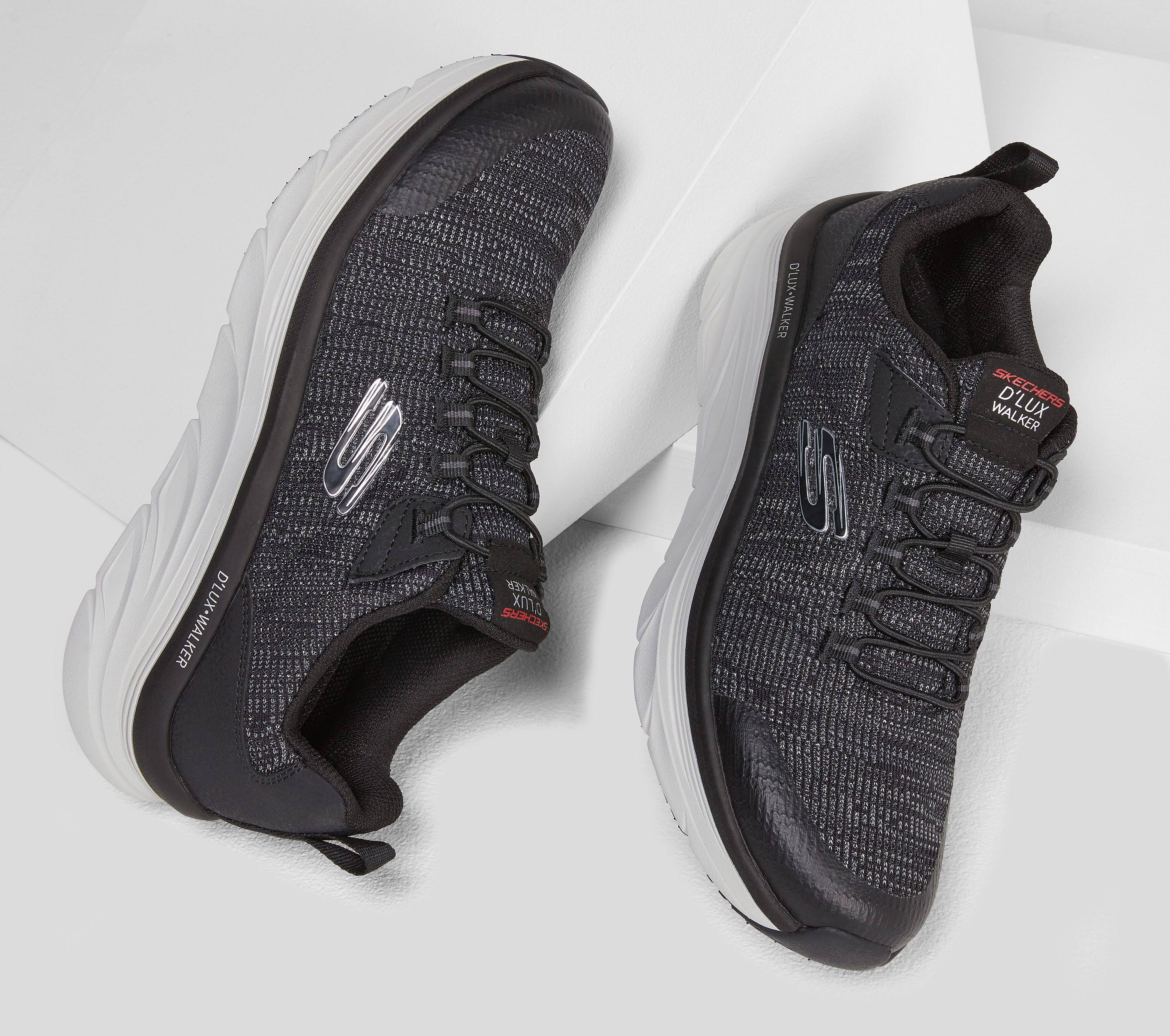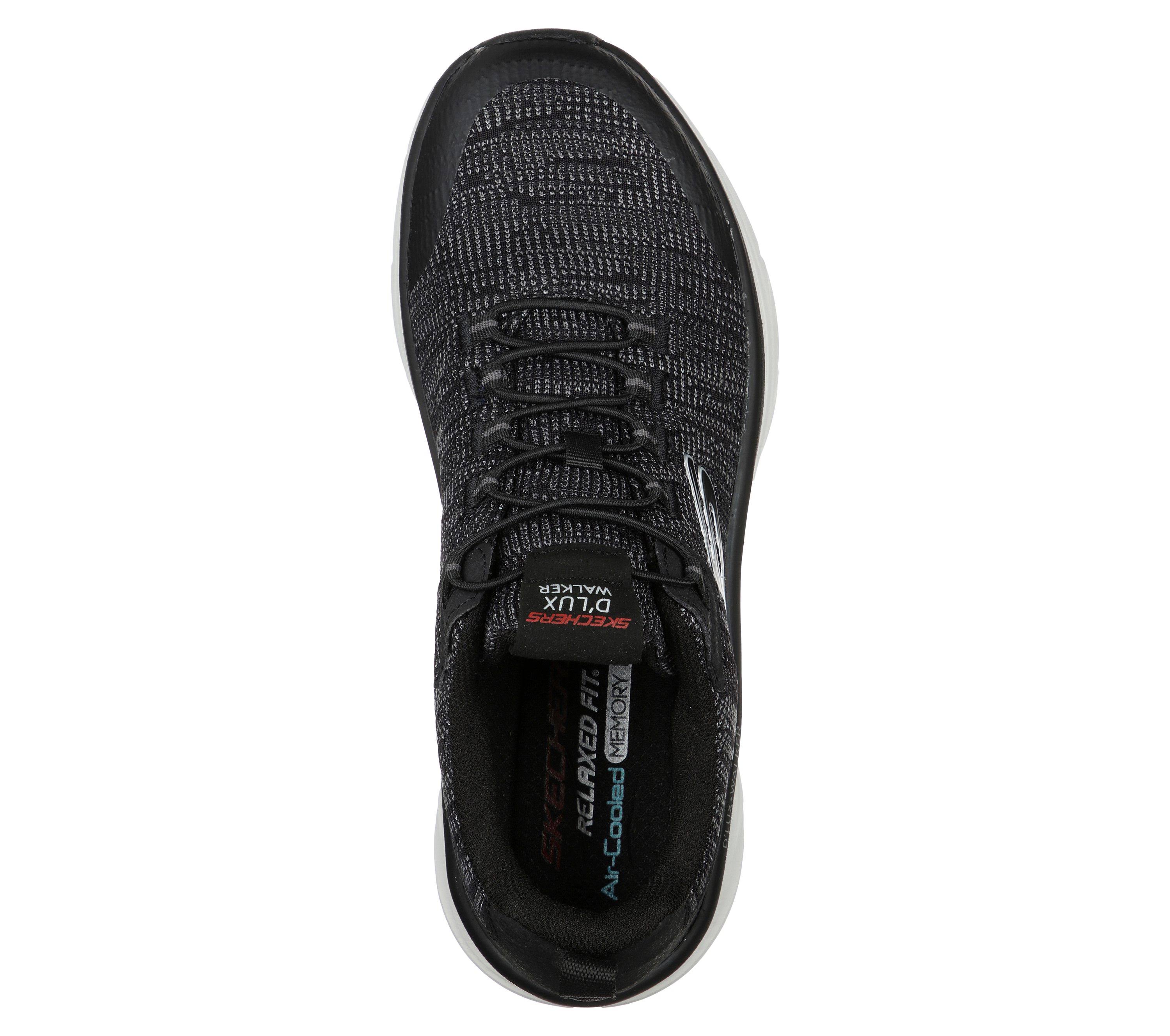 Stride in dependable well-cushioned comfort with Skechers Relaxed Fit DLux Walker - Pensive. This slip-on design features an athletic mesh and smooth synthetic upper with a bungee-laced front and cushioned Air-Cooled Memory Foam insole.