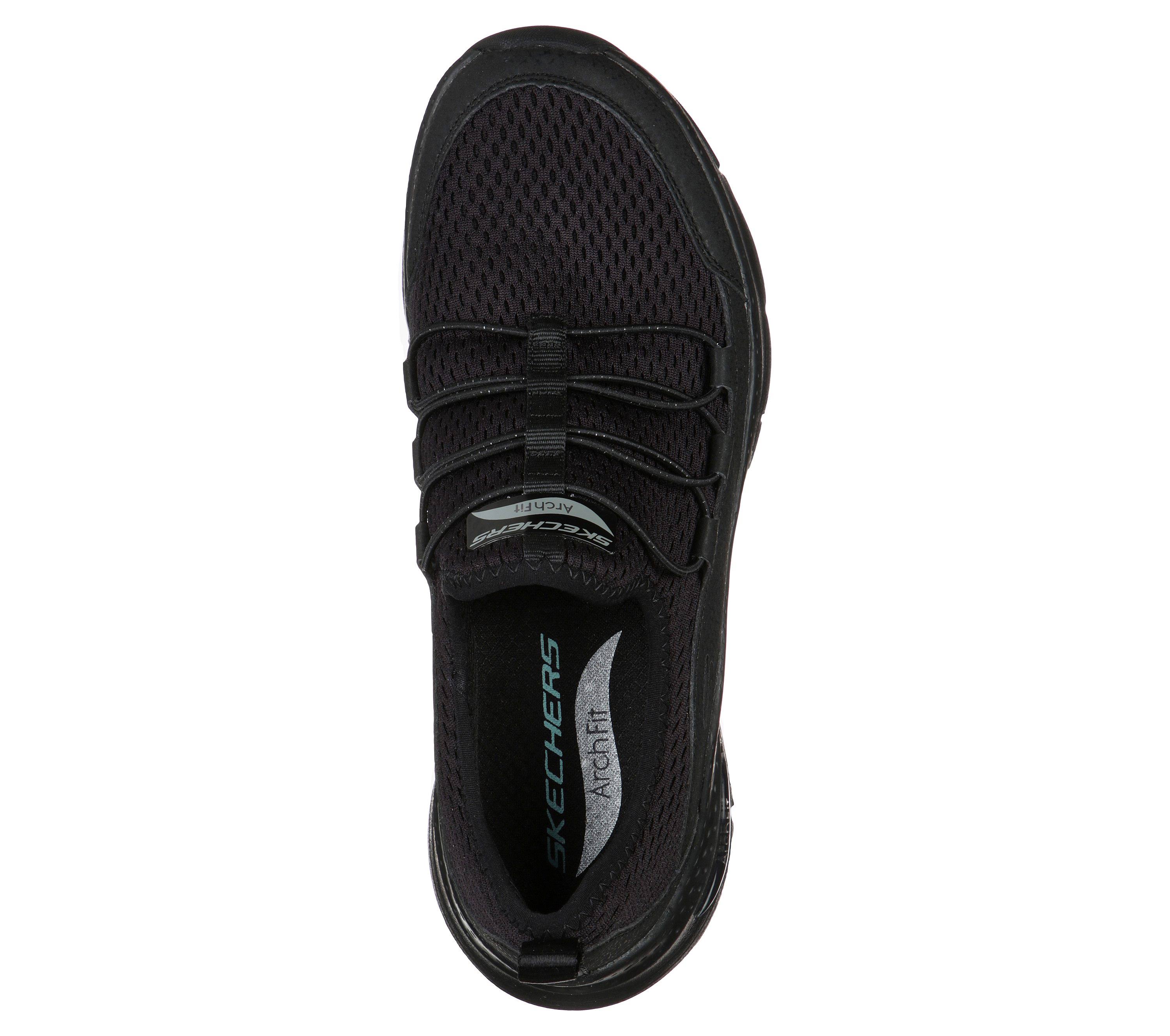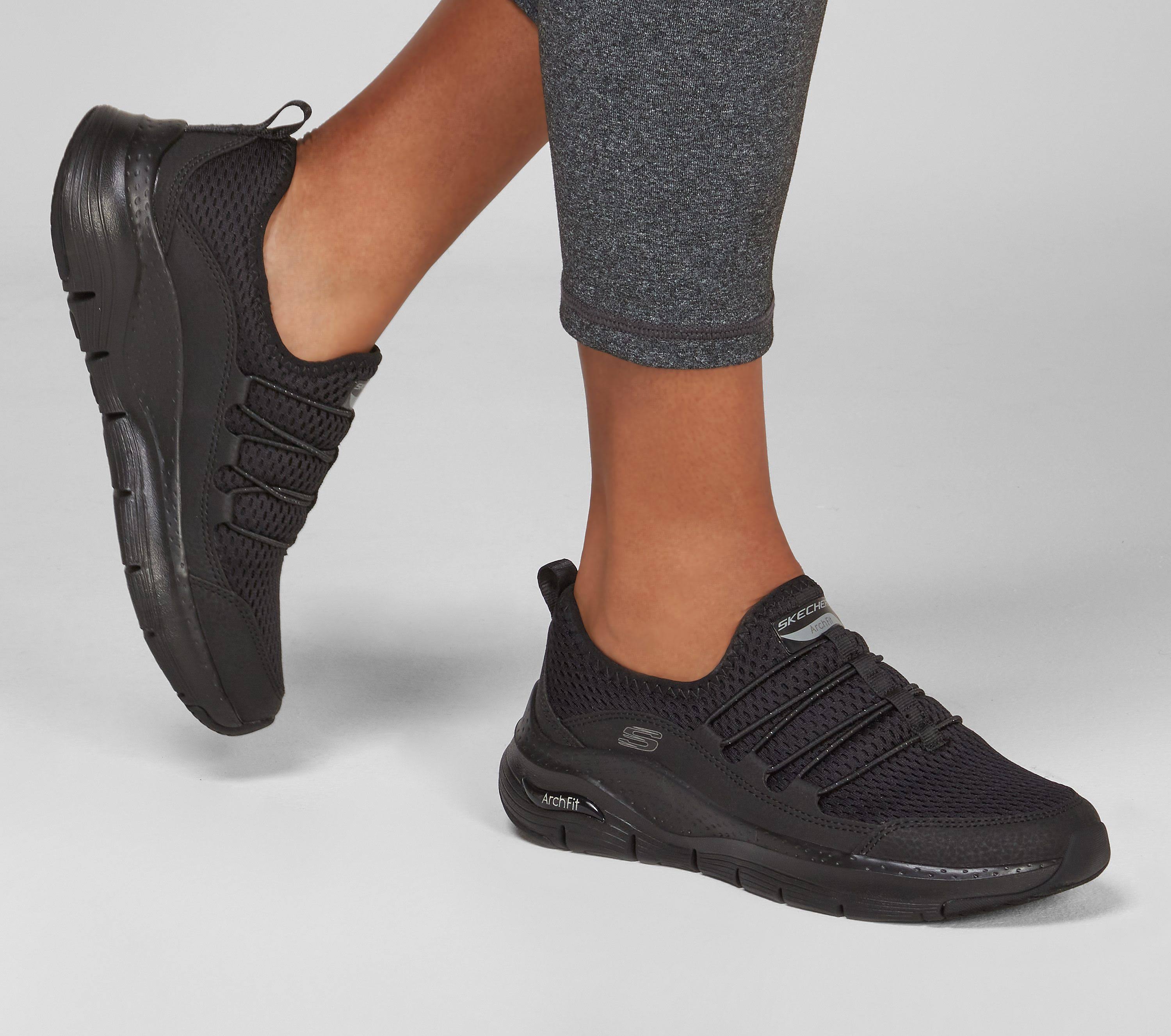 Create a trendy ensemble while going for exercise or jogging with these Skechers Arch Fit Elasticated Slip On Shoes for Women. Fabricated from mesh fabric, these shoes guarantees ventilation and breathability. They come with an elasticated slip-on style and a loop tab on the heel counter to easily put them on. The Arch fit insole system distributes the pressure across the arch for a stable, balanced and supportive posture. The resilient cushioning system supports great foot guidance. They come with a removable insole.