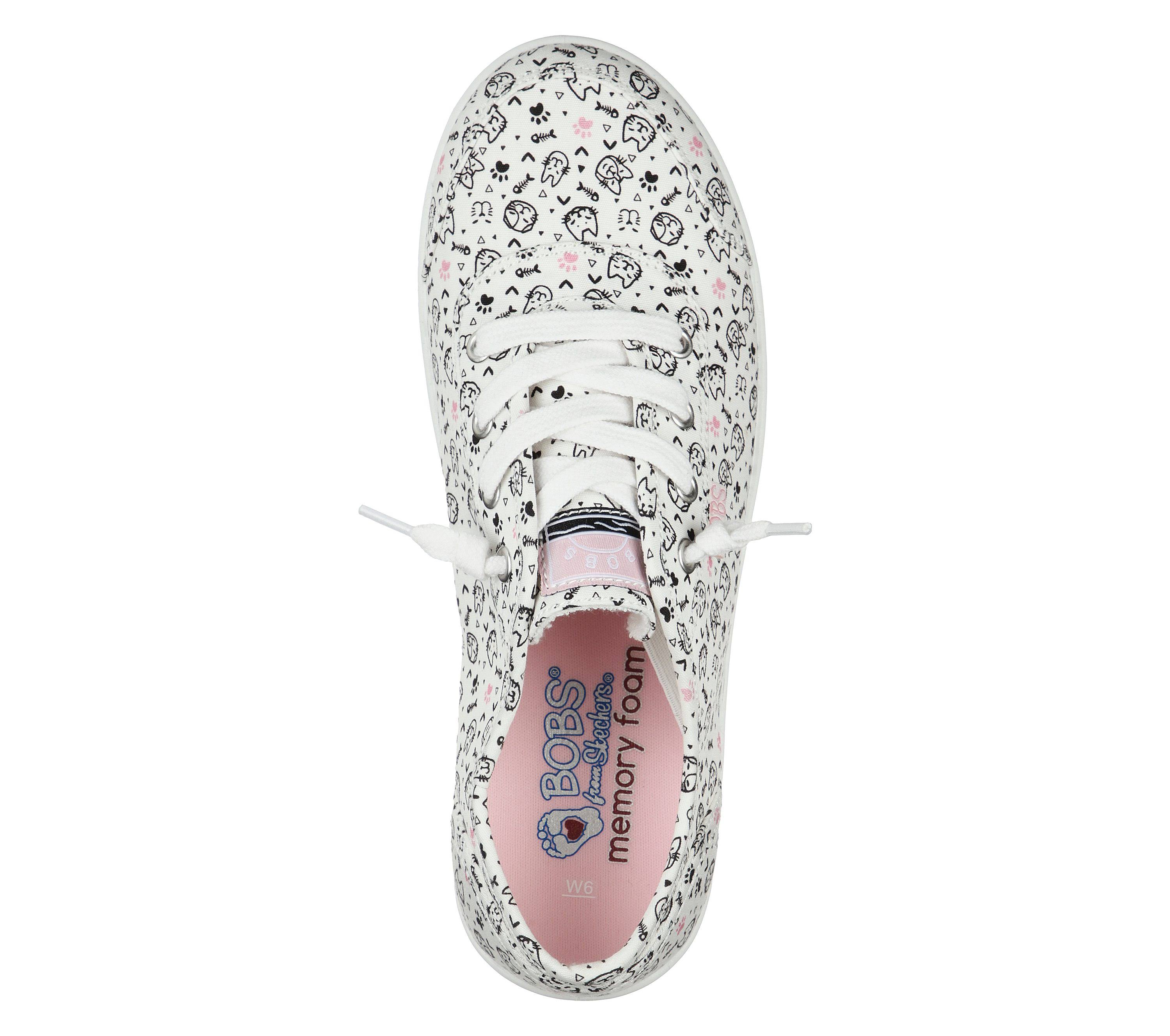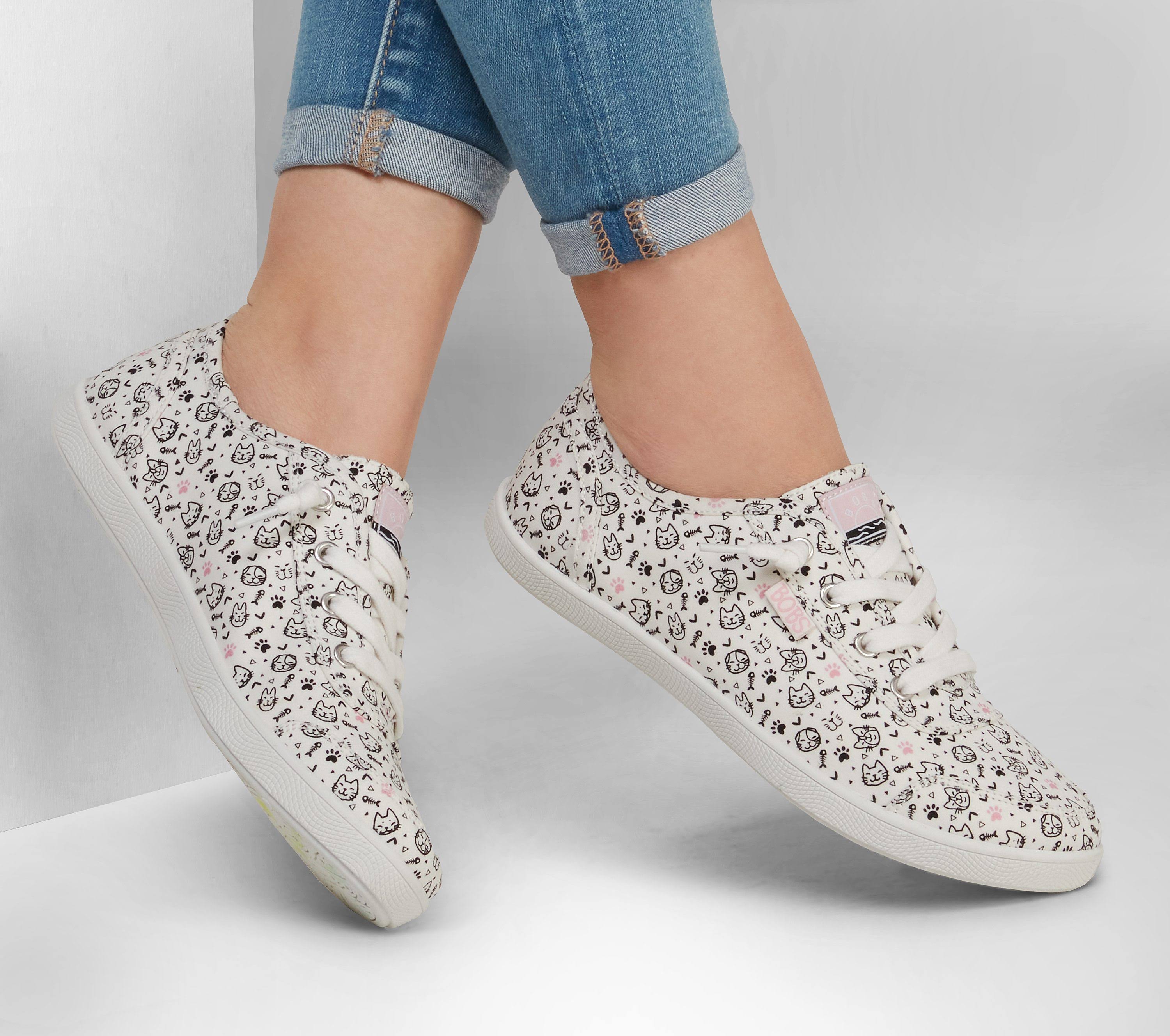 Super cute cat style and comfort combine the BOBS from Skechers B Cute - Itty Kitty shoe. This casual slip-on sneaker features a soft canvas upper with an allover Doodle cat theme print and cushioned Memory Foam comfort insole.