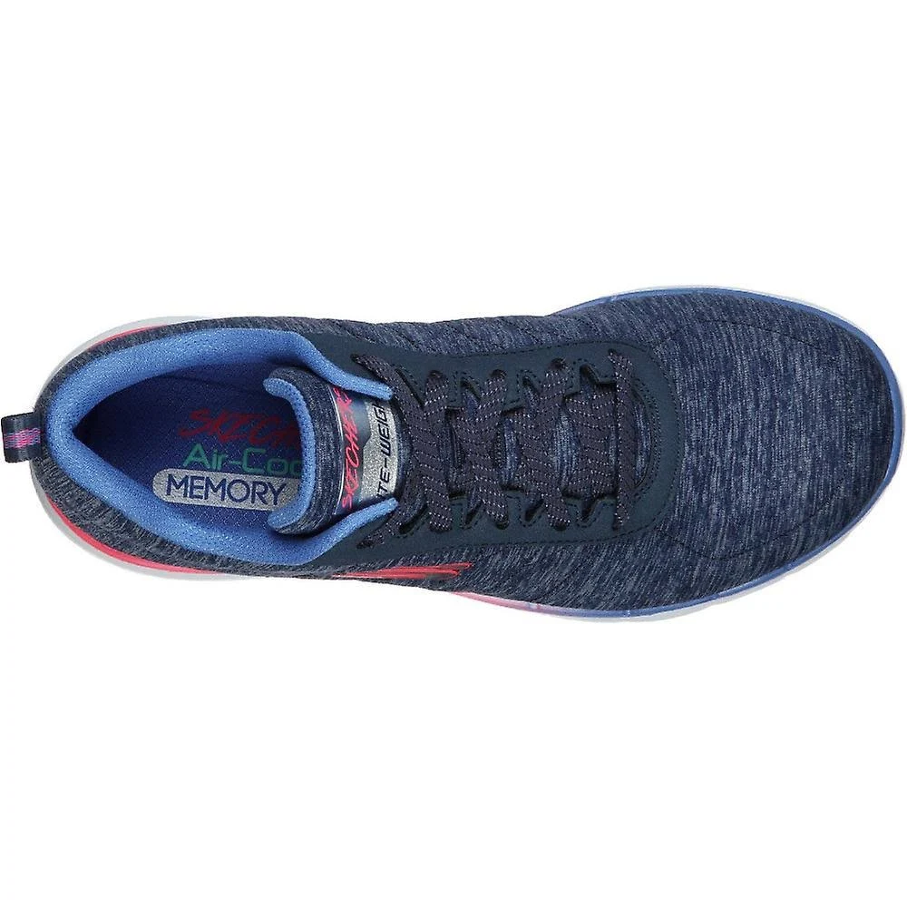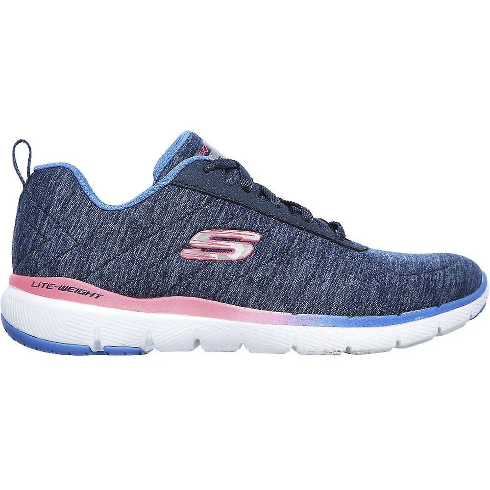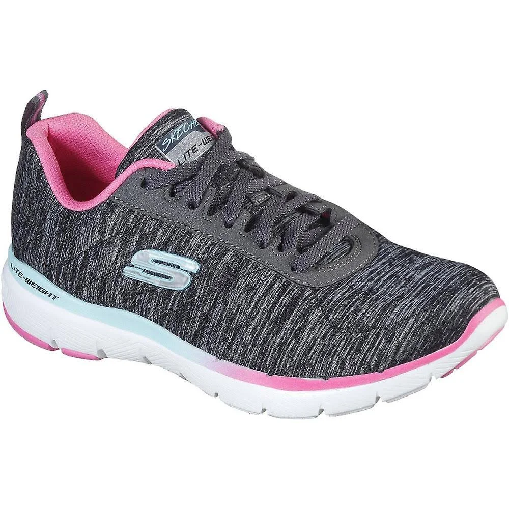 Keep your feet at ease all day long by carrying these Skechers Flex Appeal 3.0 Craze Sports Trainers. The shoes with a sporty fabric upper and lace-up fastening are tough and easy to put on. They also add smooth synthetic overlay panels for improved durability. The fabric shoe lining padded collar and tongue are additional features of the shoe for added comfort., Soft woven nearly one piece sporty fabric upper. Lace up athletic sporty training sneaker design., Knit fabric with woven-in heathered soft two-colour athletic design. Stitching detail on front and side panels., Fabric heel panel detail with top pull on loop. Smooth synthetic overlay panel at laces for added durability., Padded collar and tongue. Soft fabric shoe lining., Air Cooled Memory Foam cushioned comfort insole. Air Cooled lightweight shock absorbing midsole.