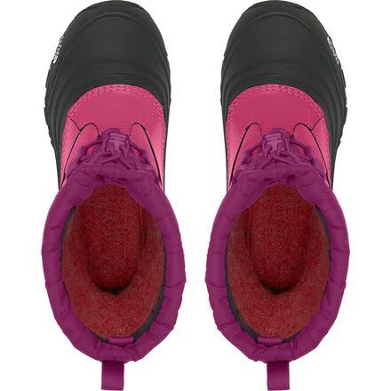For seriously warm feet when it's seriously cold out. Lightweight, waterproof winter boots keep small toes dry and toasty through snowball fights, slushy walks to school and trips to the ski hill. Bungee laces create a secure fit, but make the Alpenglow easy to pull off when it's finally time to come inside. Thermafelt Plus liners offer extra insulation for record-breaking winter days, and super-grippy outsoles keep kids upright on slippery sidewalks. Uppers are ballistic nylon with leather overlays for lasting durability. Waterproof construction and fully taped seams keep water on the outside. Bungee lace system and collar for a secure fit that keeps snow out. Thermafelt Plus removable liner provides warmth down to -32°C. Midsoles and lower shells are made of flexible and lightweight thermoplastic rubber. TNF Winter Grip rubber outsole for all-weather traction.