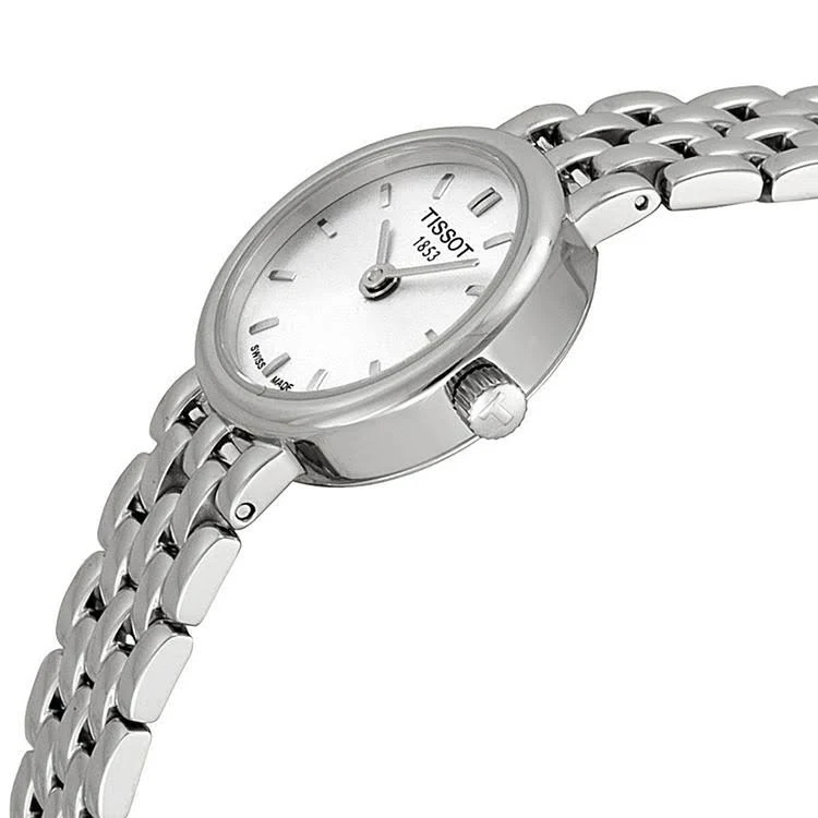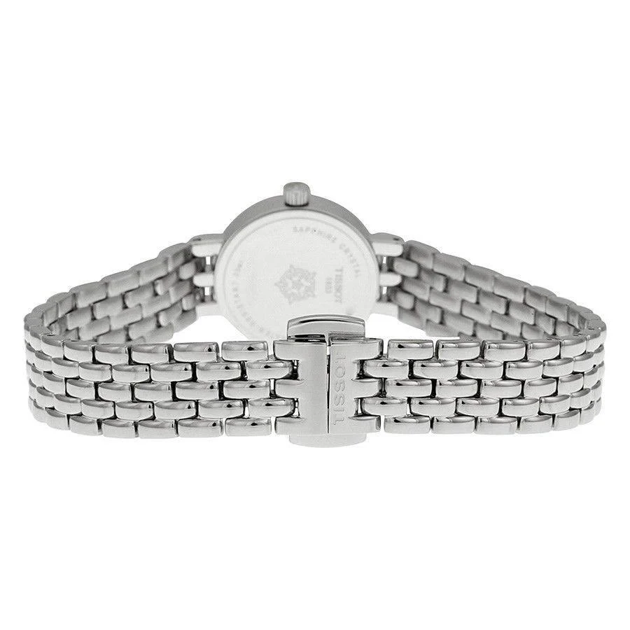 The Tissot, T-Trend Collection series features a stainless steel 19.50mm case, with a fixed bezel, a silver dial and a scratch resistant sapphire crystal. The 11mm stainless steel band is fitted with a deployment with push button release clasp. This beautiful wristwatch, powered by a ETA Caliber 901.001, Swiss quartz movement, supporting: hour, minute functions. This watch has a water resistance of up to 100 feet/30 meters, suitable for short periods of recreational swimming. This stylish Swiss-made timepiece is sure to complete any woman's collection.