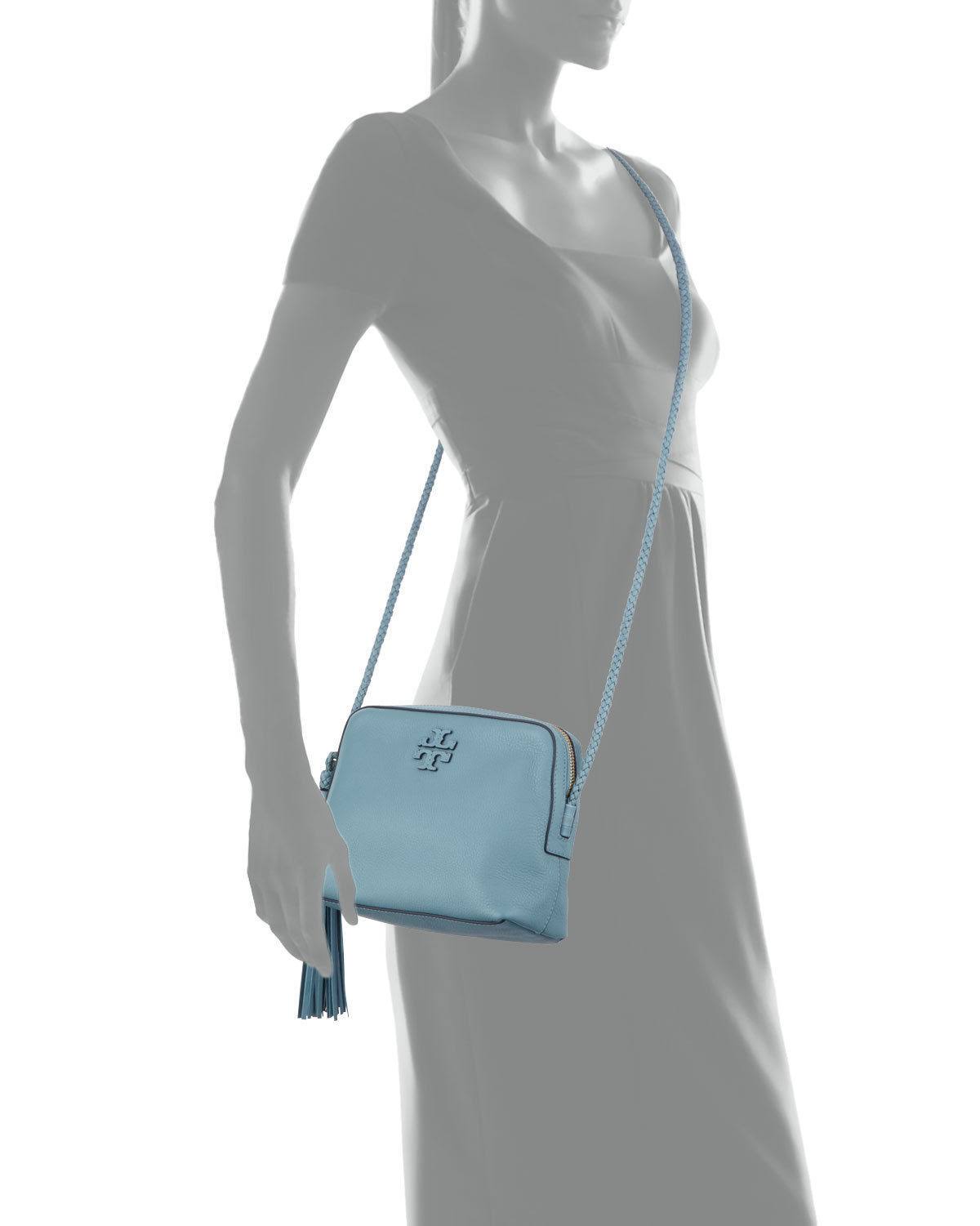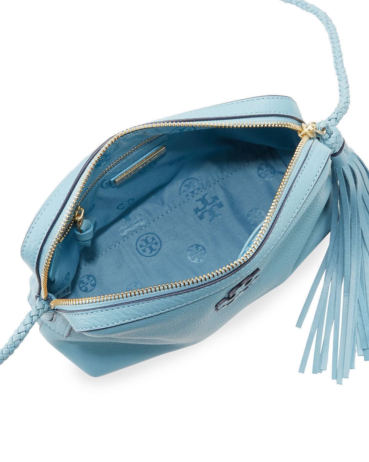 Taylor Camera Bag is crafted in rich pebbled calf leather giving your chic look a refined touch with a '60's spin. Featuring zip closure with tassel detail braided leather shoulder strap internal zip and open pocket double-T logo detail on front signature lining and gold tone hardware. Tory Burch collection.