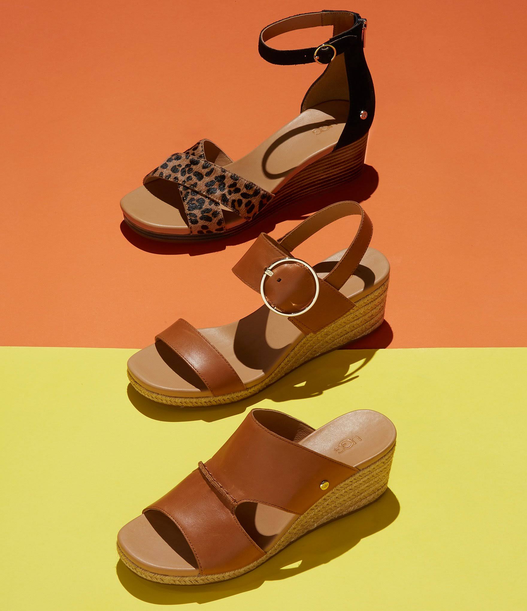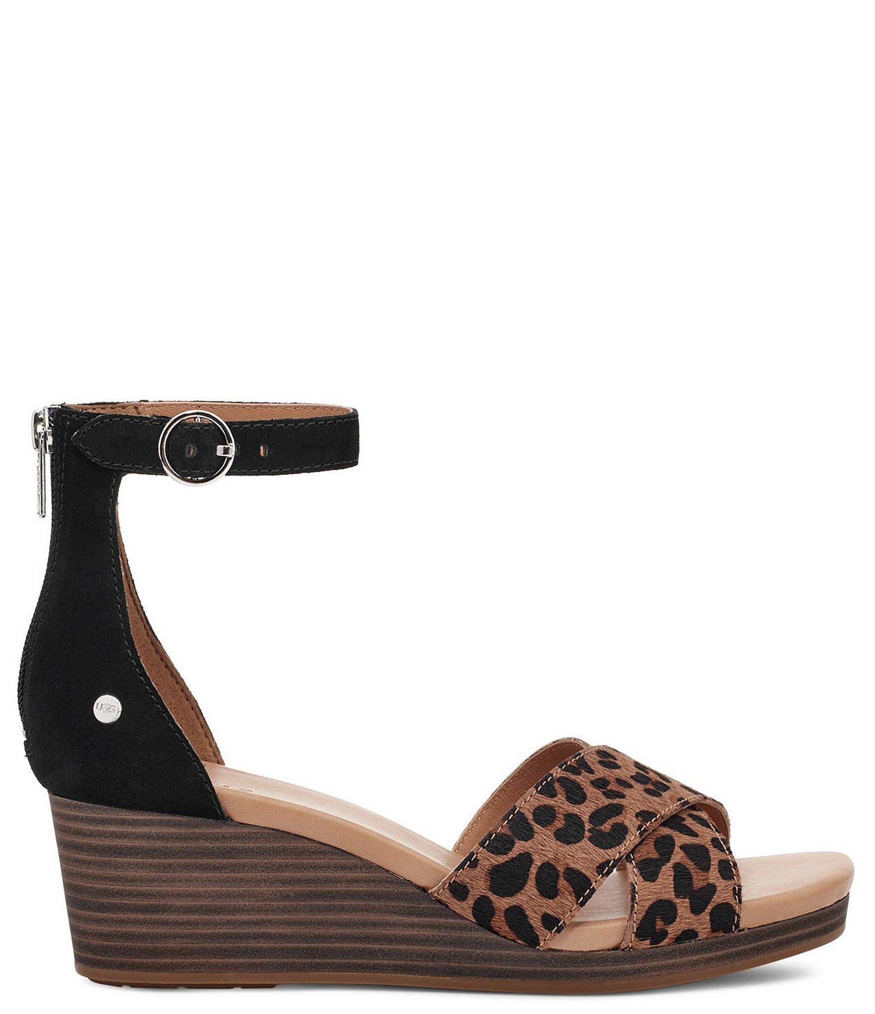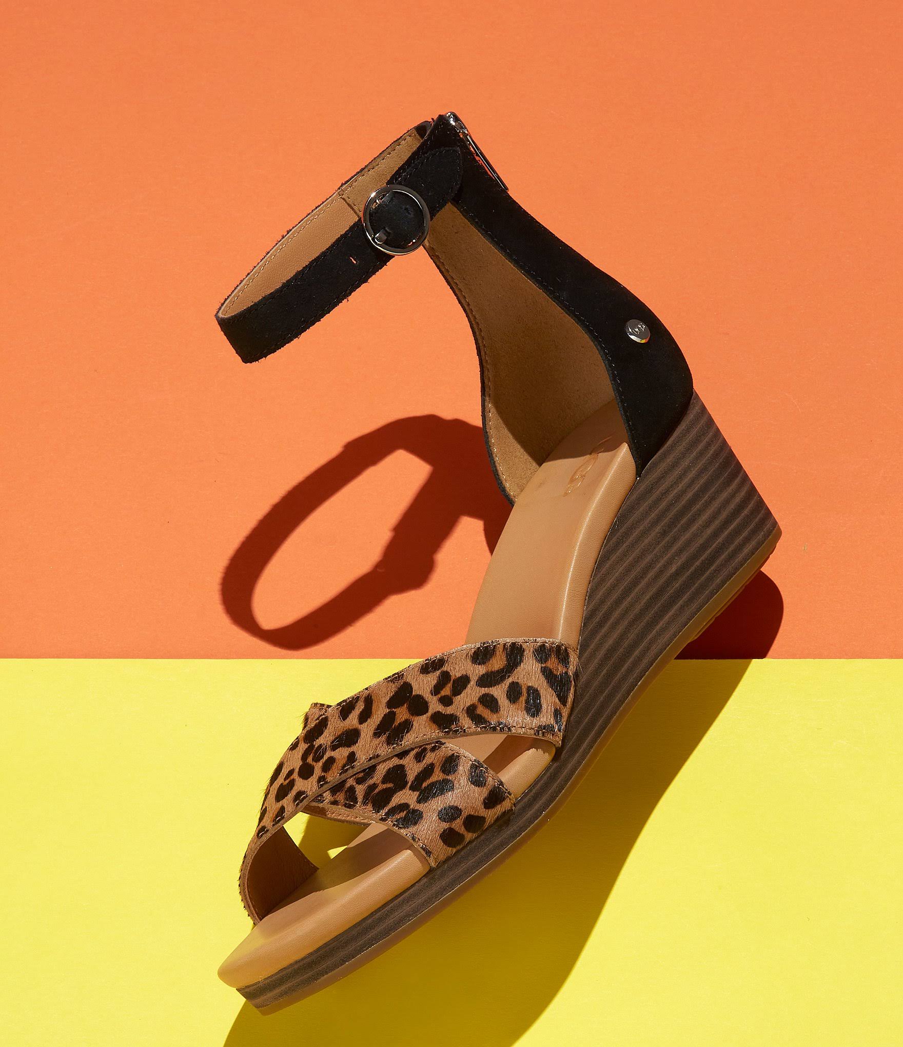 UGG Eugenia - Women's Shoes : Black/Tan : Your favorite floral dress is a perfect match for the UGG Eugenia sandal. Adjustable ankle strap. Functional zipper for easy on and off. Elegant stacked heel. Leather upper. Leather and microfiber lining. Synthetic sockliner. Durable rubber outsole. Imported. Weight of footwear is based on a single item, not a pair.