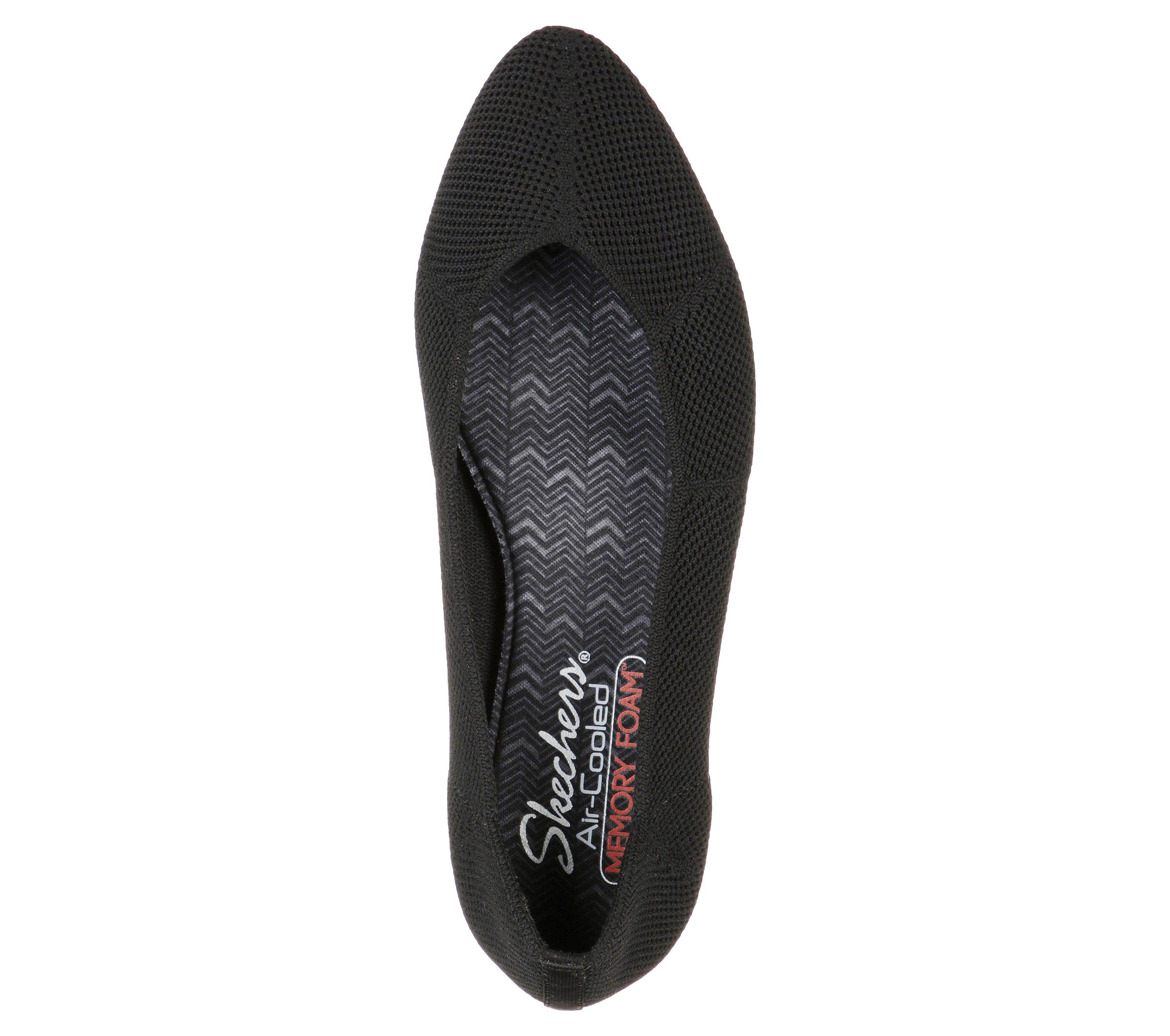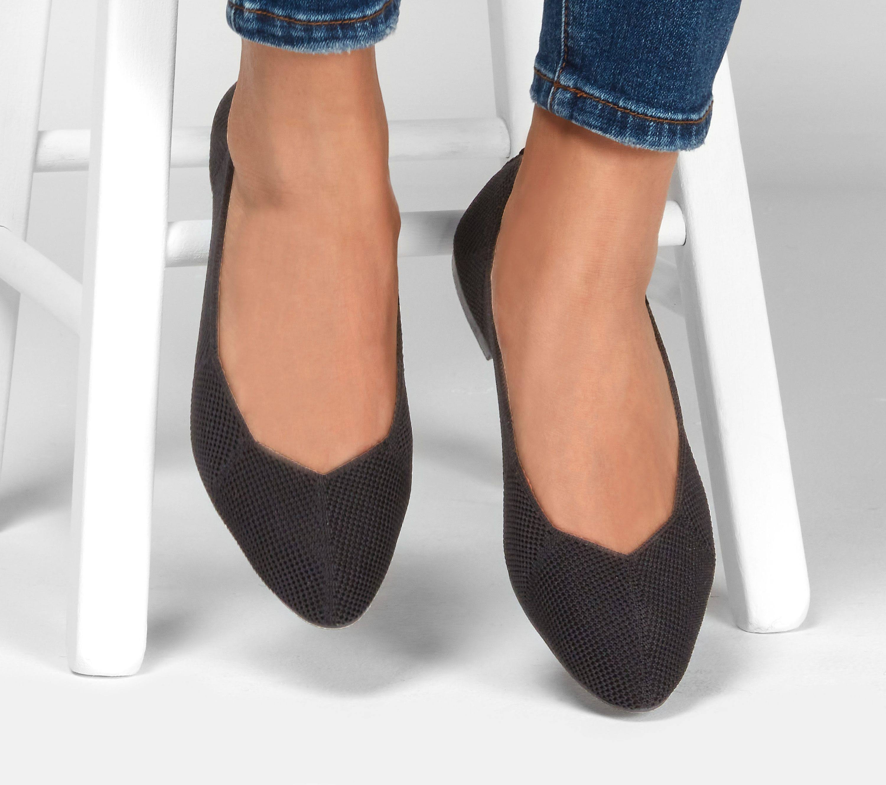 Show off your multi faceted style with sleek stretch comfort in the SKECHERS Cleo - 3 Carats shoe. Soft stretch fabric upper in a slip on casual dress ballet flat with stitching and knit-in accents. Soft stretchable woven fabric upper. Knit fabric with woven-in texture detail. Stitched seam design for 'faceted' look. Slip on casual dress comfort ballet flat design. Solid colored fabric heel stripe. Stitching detail on heel overlay. Seam accents for stylish front panel look. Sculpted instep area for added style. Stretch Knit soft collar design for flexible comfort. Soft fabric shoe lining. Fabric topped insole. Air Cooled Memory Foam cushioned comfort insole. Flat midsole. Flexible rubber traction outsole. 18 inch heel. Machine Washable. Imported.