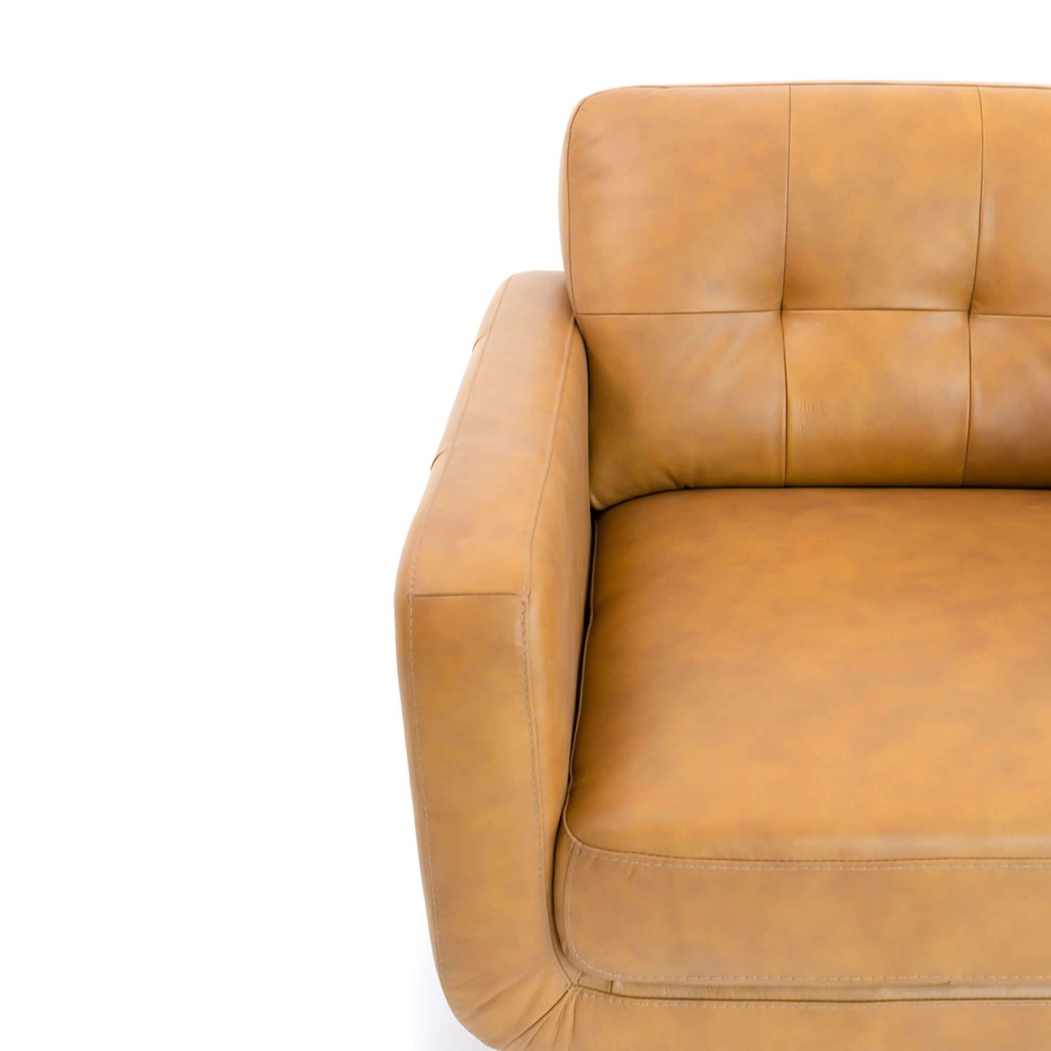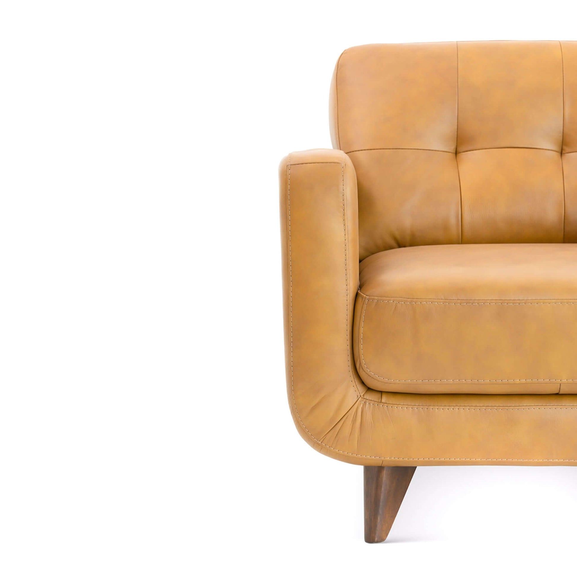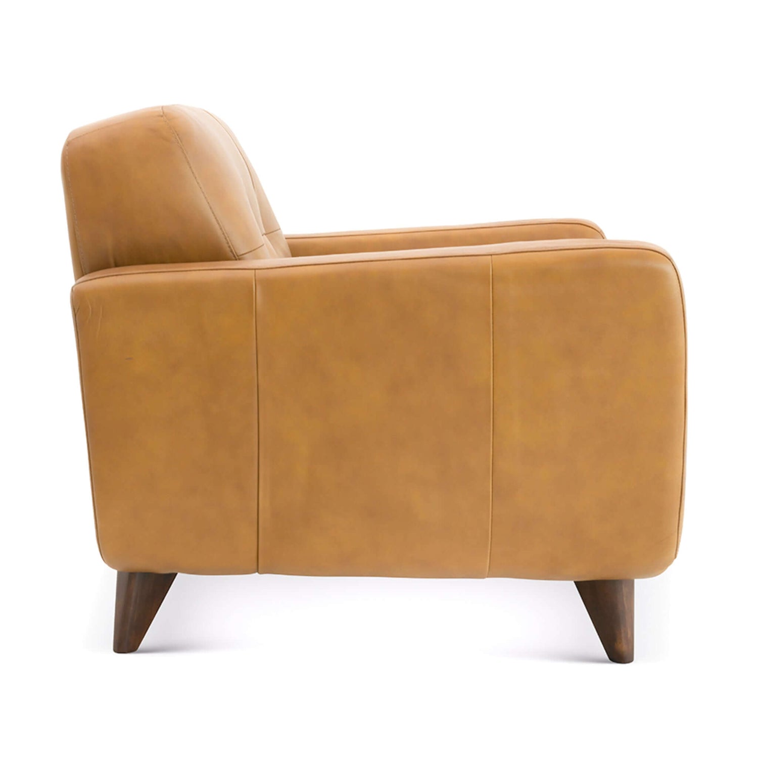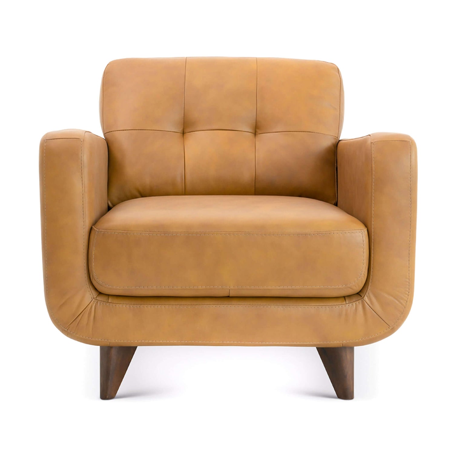 Add an extra spot to the den or living room with this sleek mid-century armchair. It sits on four walnut-finished legs and is crafted with a solid wood frame. High-density foam padding adds cozy comfort, while the durable, high-quality leather upholstery adds a luxurious, distinguished touch we love. Elegant square arms and a fully padded back offer extra style and cushion. Plus, it has removable legs, so it's easy to move, even in tight spaces. Due to the natural characteristics of the leather, the texture and color may vary.
