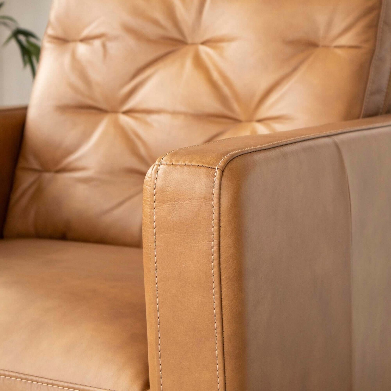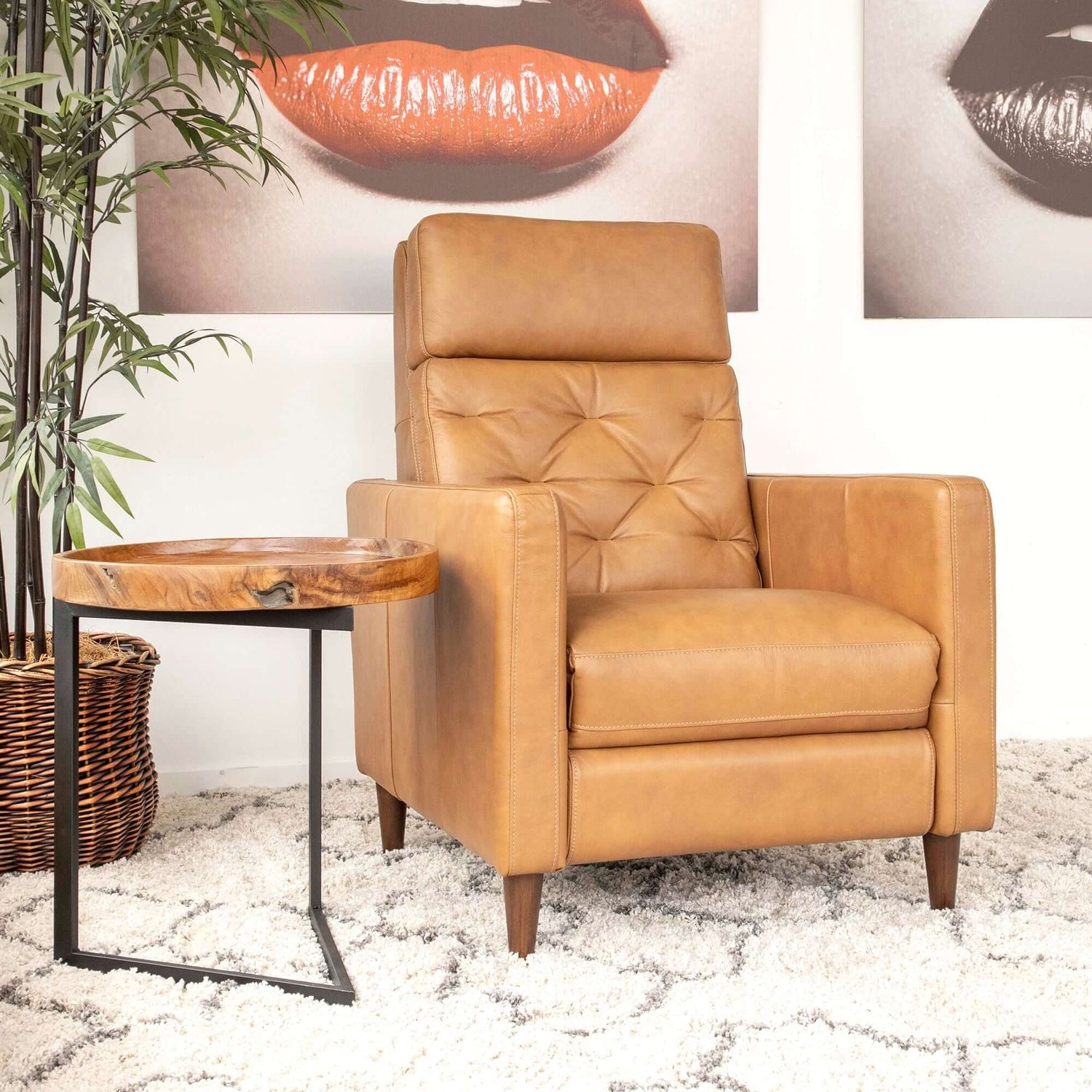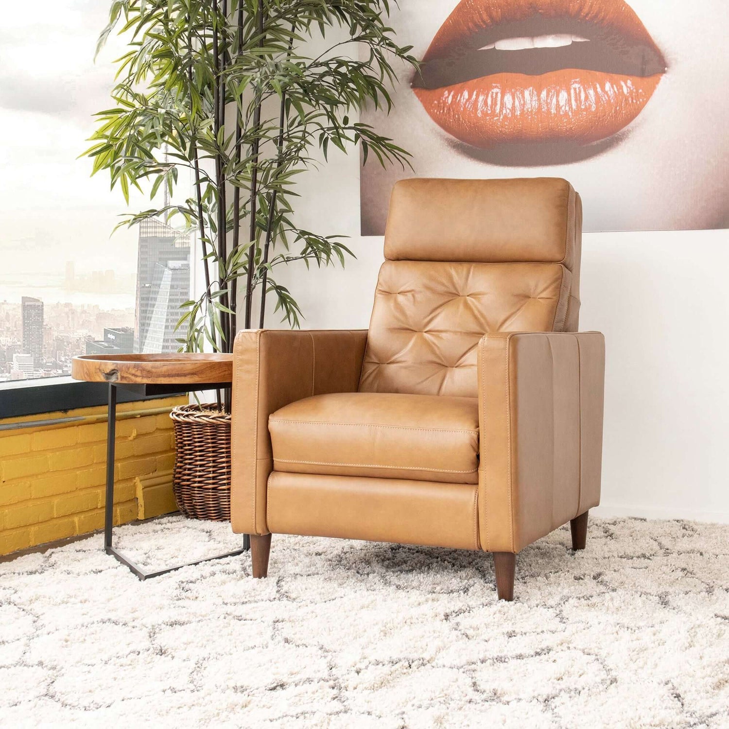 Your to-do list is complete, now it's time for ultimate relaxation with the mid-century modern style Vandergriff Tan genuine leather Recliner Chair. Combining durable, top-quality craftmanship and this sofa will provide you with great comfort and undoubtedly become the centerpiece of your living room, den, urban loft, condo or home office. It is made of genuine leather and Can be cleaned with a non-abrasive cleaning solution followed by a quick microfiber cloth. Removable legs allow for simple delivery for tight spaces. Available in a variety of timeless colors, you're sure to find something that matches your decor. Due to leather's natural characteristic, texture and color may vary