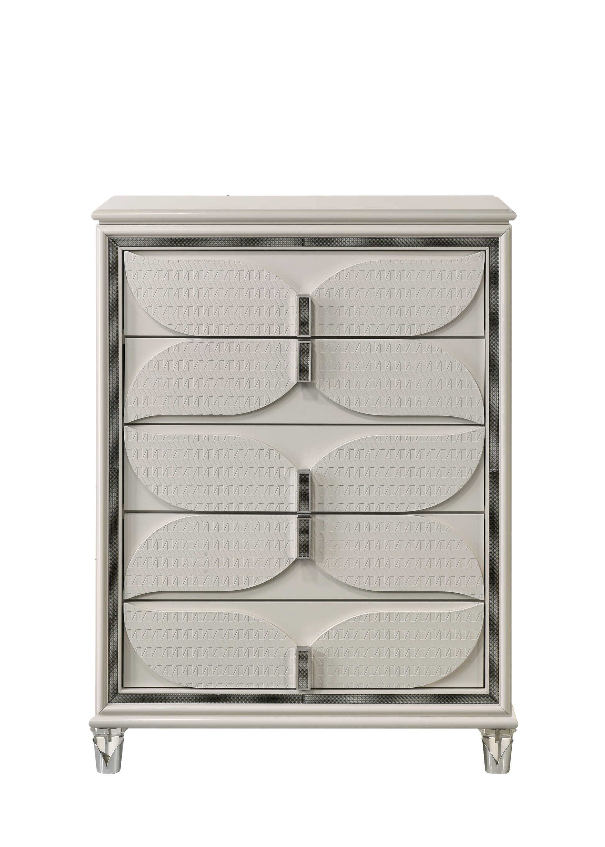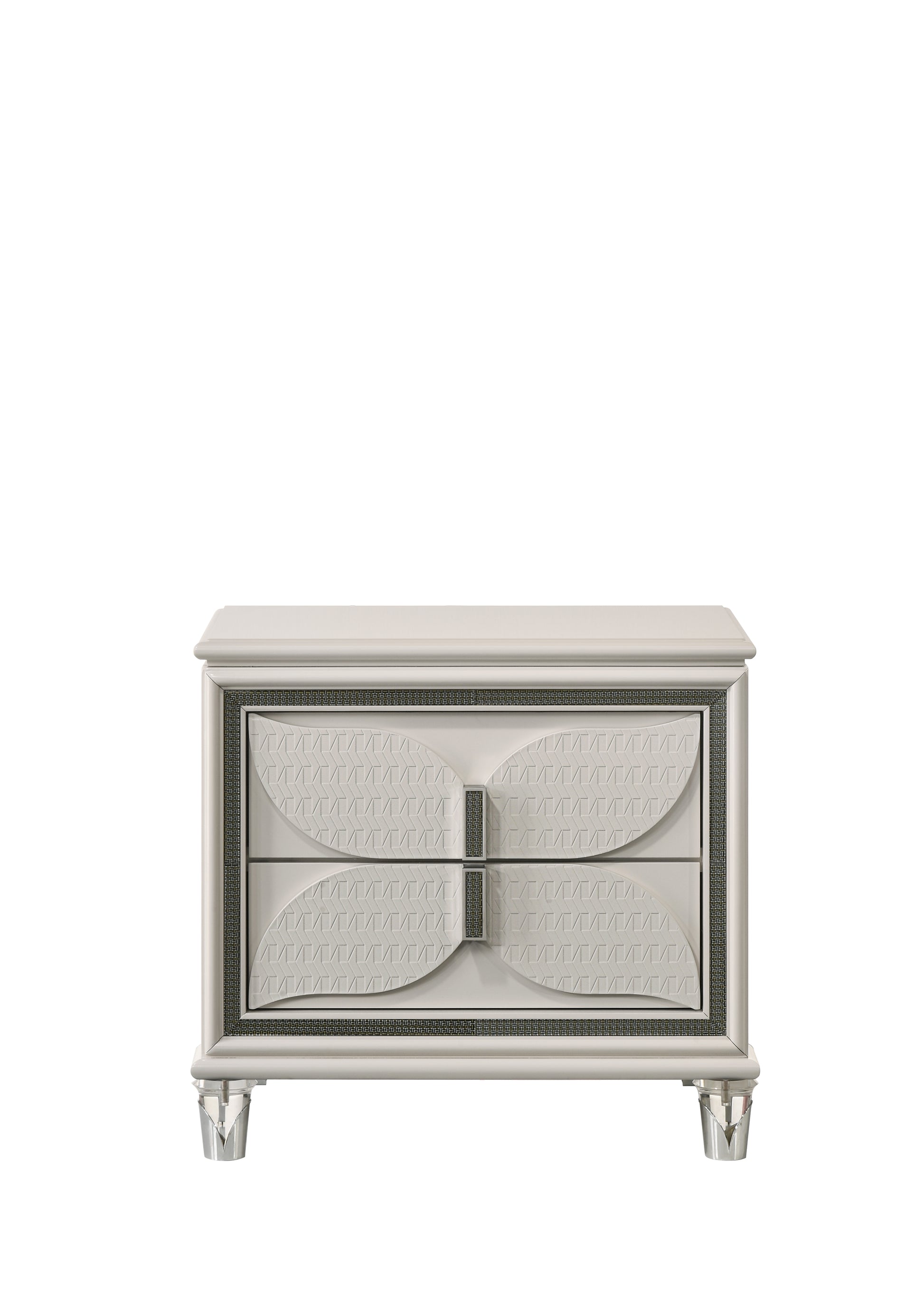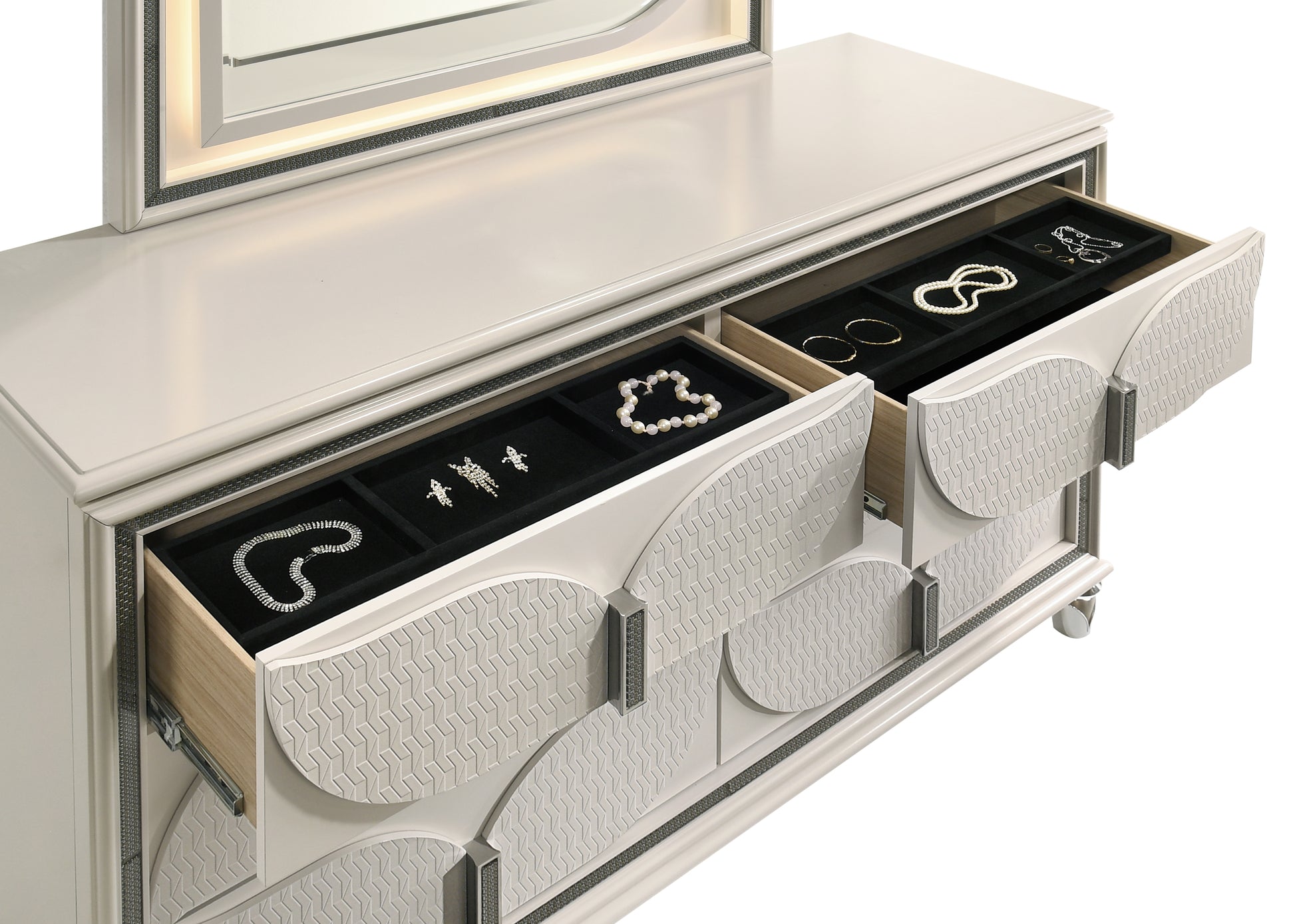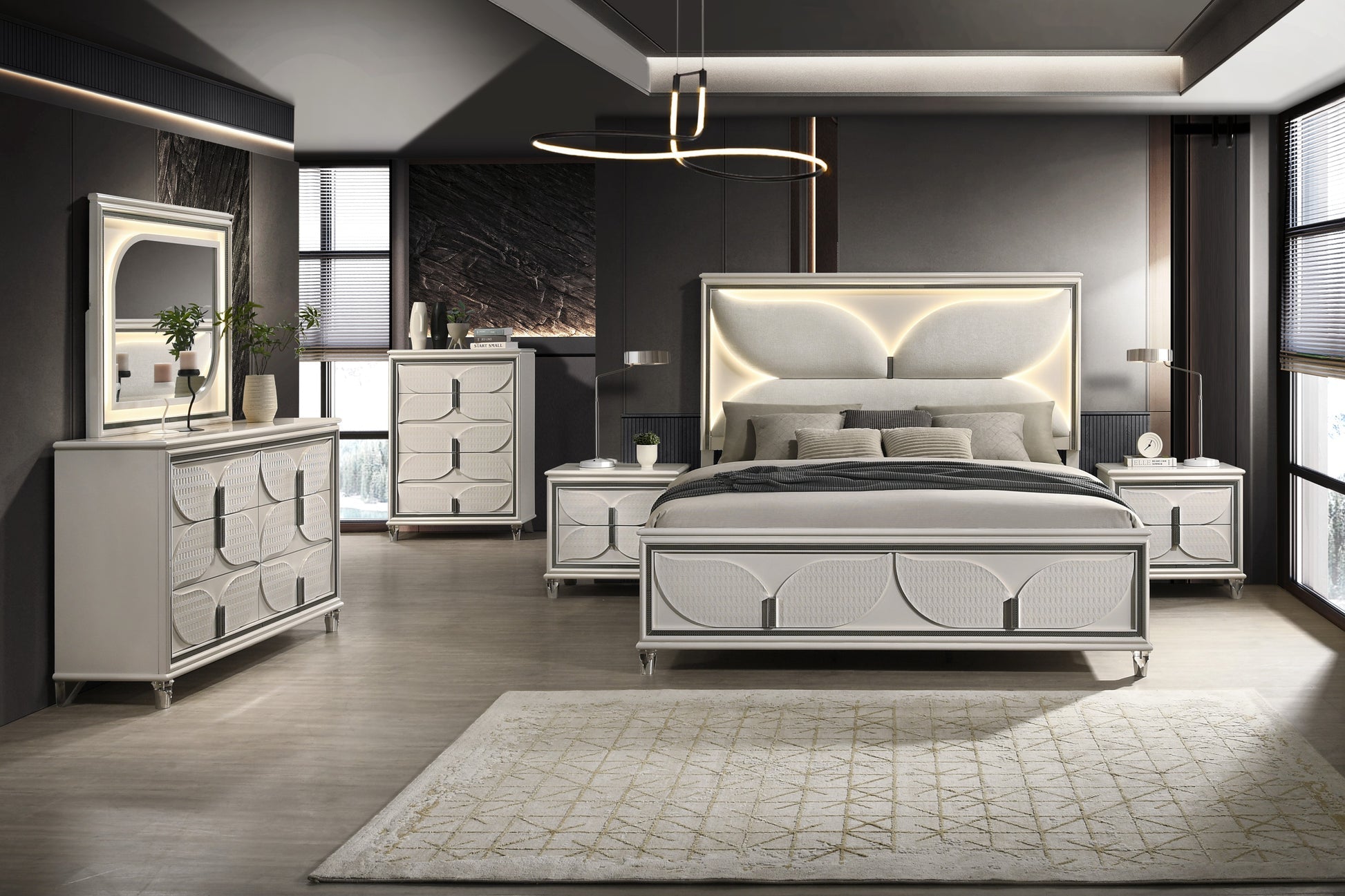 Experience the B6800 from the Hayma collection by New Era Innovations in an elegant Mysterious Gold finish. This set features a comfortable upholstered padded headboard with integrated LED lighting and a sleek LED mirror. The nightstand includes both USB and Type C ports for effortless device charging, while the dresser offers top drawers with a dedicated jewelry tray to keep your essentials organized. Crafted with stylish acrylic and metal legs, this collection blends modern design with practical convenience.